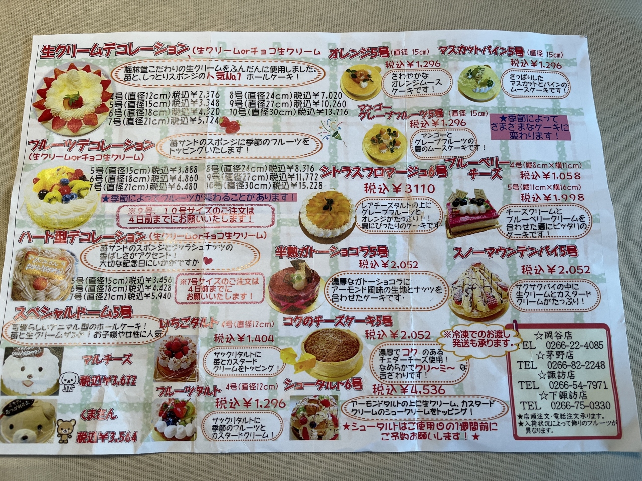 避暑で滞在中の蓼科で、孫たちの誕生日を迎えるのでバースデーケーキを検索したらヒットしたのがこの店です。1913年(大正2年)創業、「くるみやまびこ」や「諏訪の月」が有名な岡谷本店の老舗です。茅野店はメルヘン街道の国道152号沿いにあります。