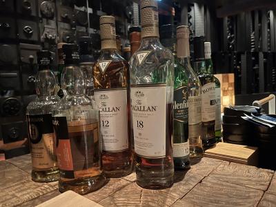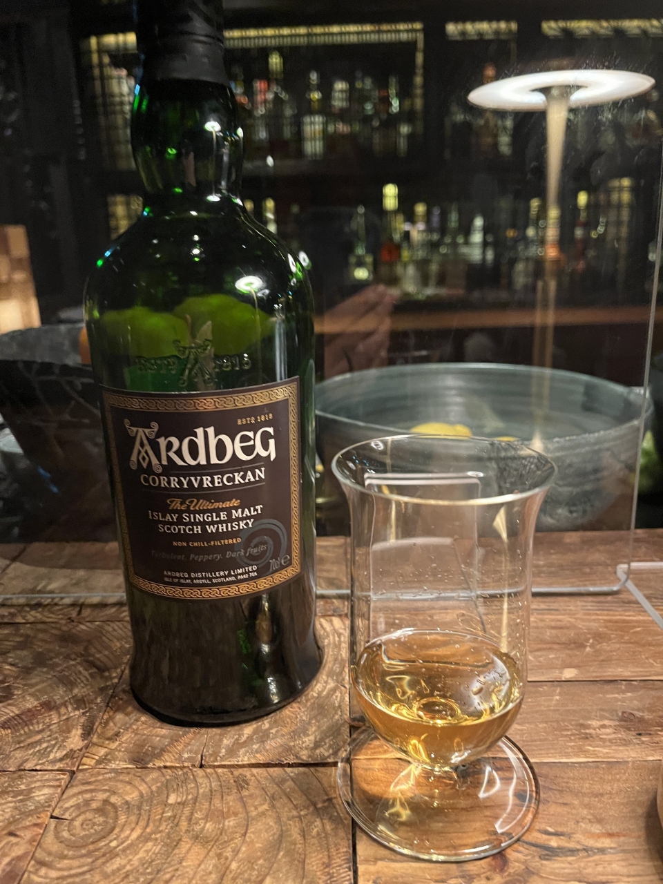 カウンターを選び席に着くと、目の前にアイラを中心にウイスキーボトルが10本ほど並んでいます。「これ全部、我が家にある」と私が言うと、おもむろに棚の奥からバーテンダーが出してきたのがアードベッグ・コリーヴレッカンです。かねがね私が特別な機会に飲んでみたいと思っていた銘柄、一本取られました。ピーティーな特有の香りにフレッシュさを感じる味わい、なるほどと感心します。