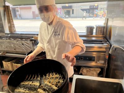 本店は松本市内にある本間川魚店、1945年(昭和20年)創業の老舗です。本店はテイクアウト専門、深志の井上百貨店内に店舗を構え、その縁でアイシティ21にも出店したと思われます。