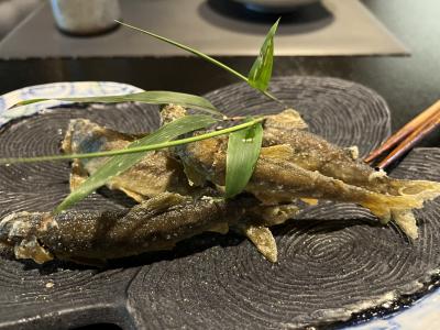 若鮎の沢揚げ(わらびのイカ和え添え)