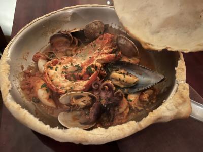 ズッパディペッシェ(魚のスープ)は生のロブスターにこだわり、魚介の旨味に溢れています。やや塩辛いですが、本来は漁師めしなので納得できます。スープを蒸す際に使ったカバーのピザ生地もいただけます。絶品です。