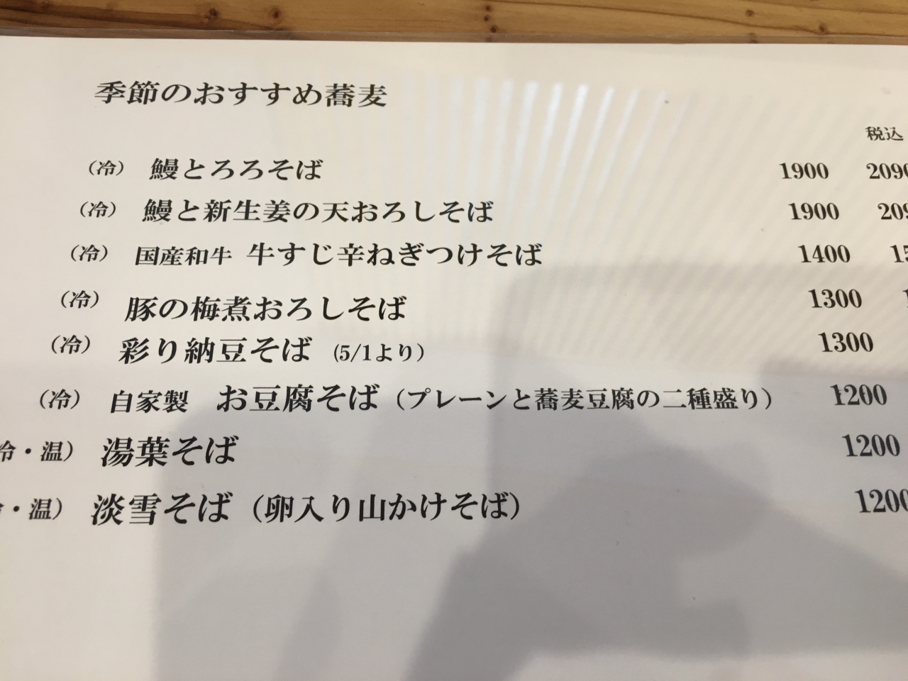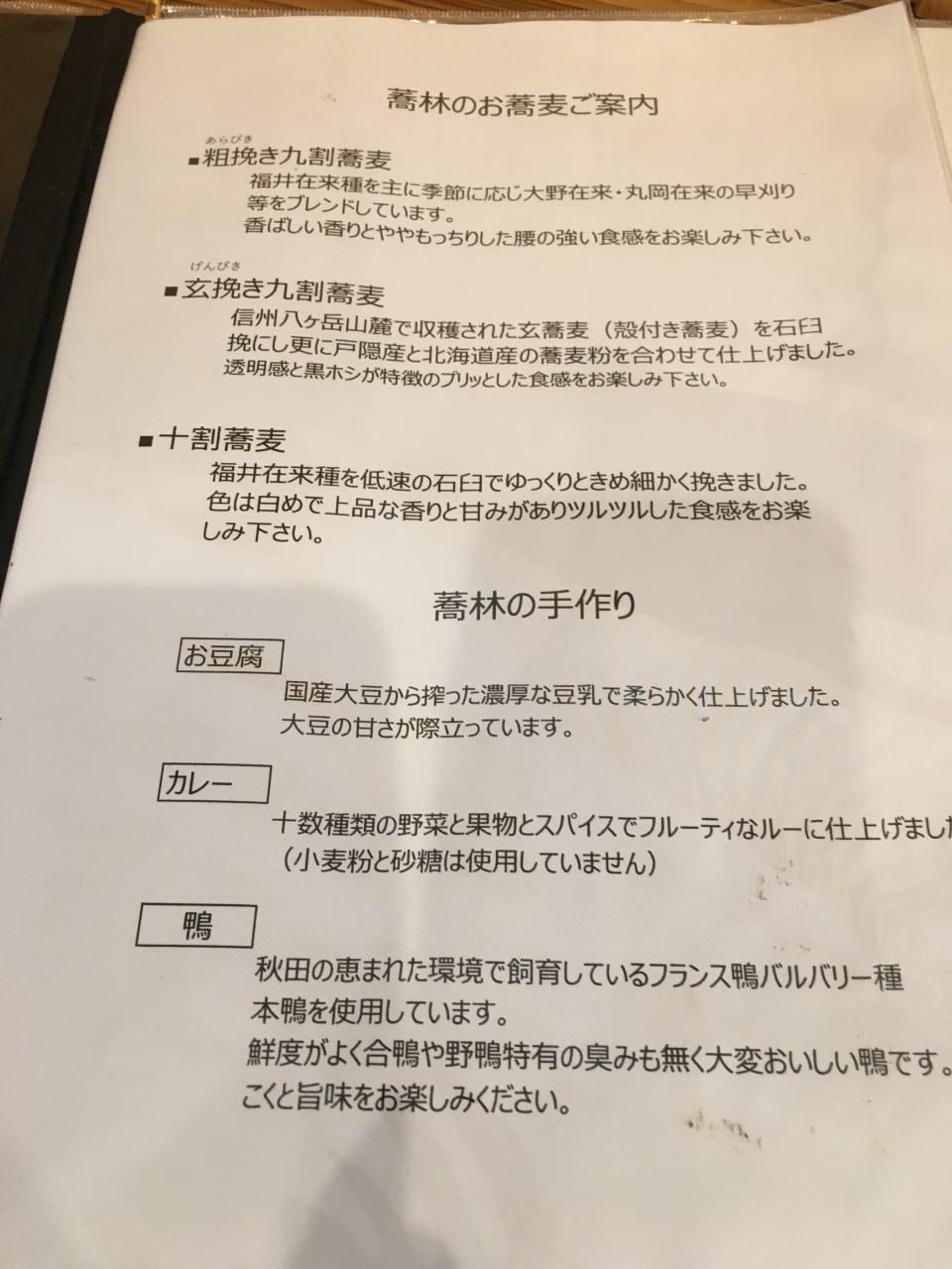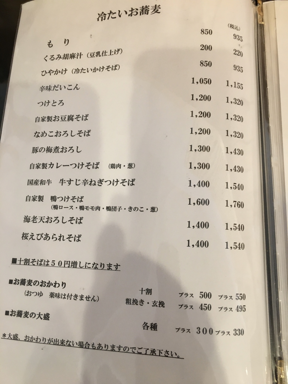 冷たいお蕎麦13種、温かいお蕎麦11種の他に季節のおすすめ蕎麦もあり、メニューは多彩。しかも、それぞれ「粗挽き九割蕎麦」「玄挽き九割蕎麦」「十割蕎麦」からひとつ選べるというこだわりです(十割蕎麦は50円増し)。もちろん手打ち。