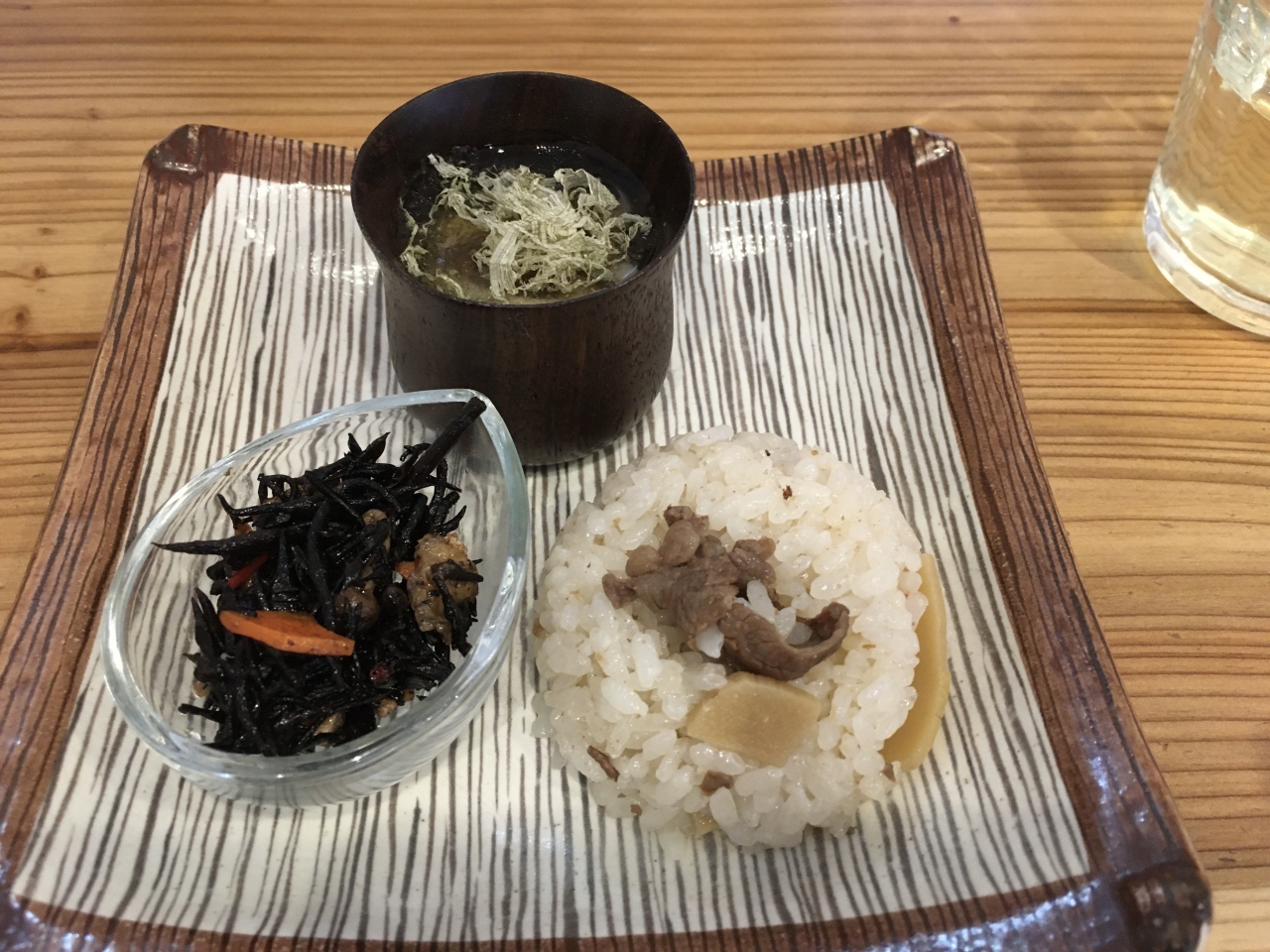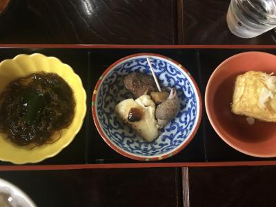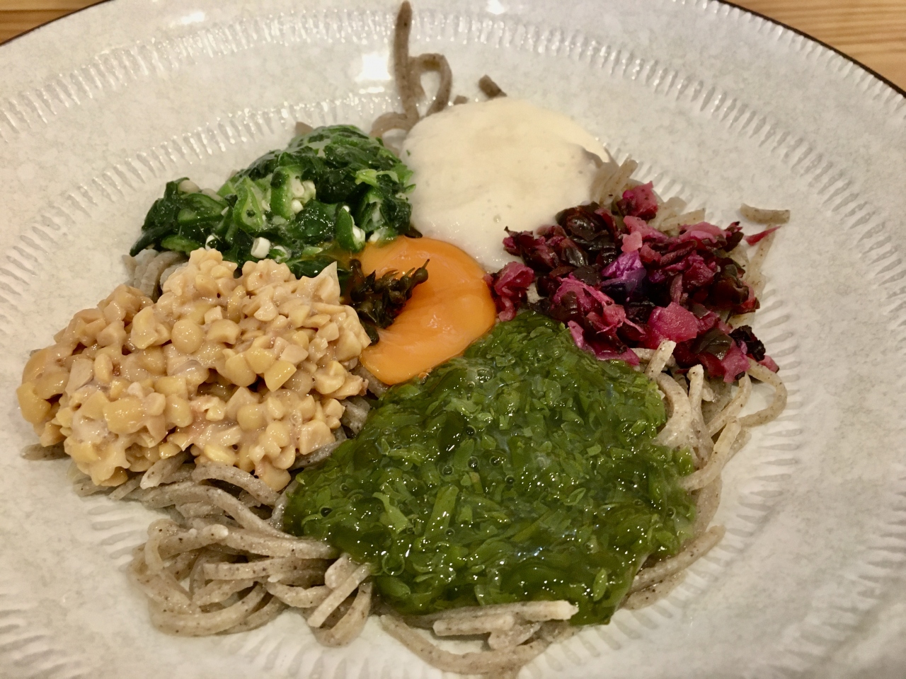 季節の蕎麦から彩り納豆そば(1430円)をチョイス、注文するとまずお通し3品が出てきます。この日は湯葉、ひじき、牛肉炊き込みご飯でした。蕎麦屋は本来、飲み屋ですので普段はこれで1杯やるところでしょうが、この日は神奈川県にまん延防止等重点措置が適用されているので、酒類の提供はありません。でも、1品1品選び抜かれた素材でどれも美味しくいただきました。