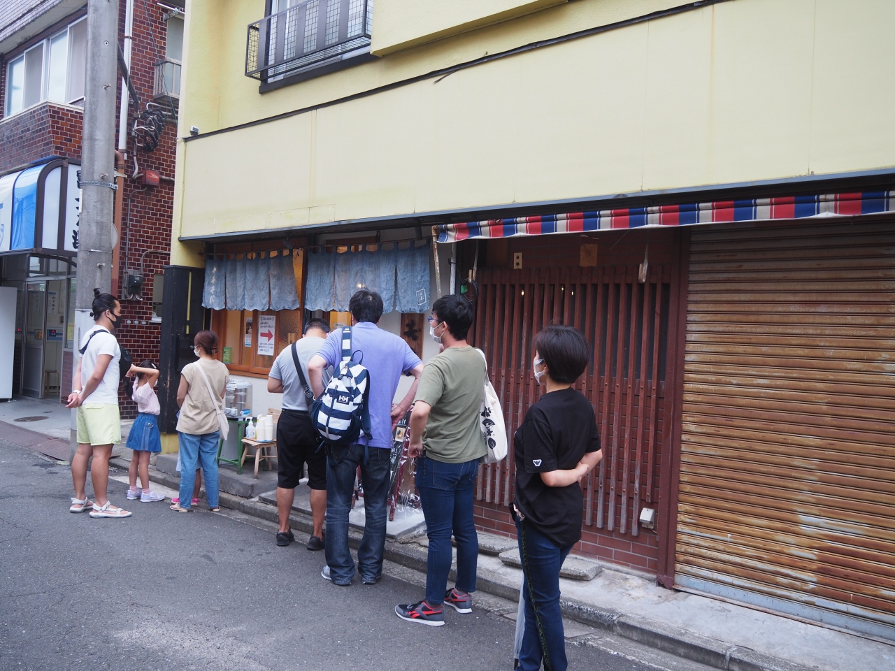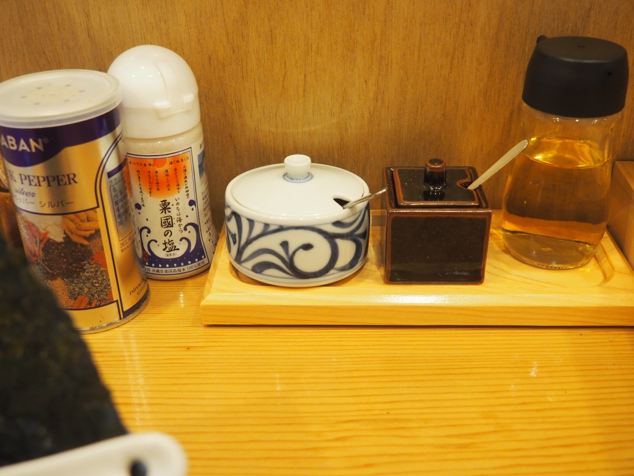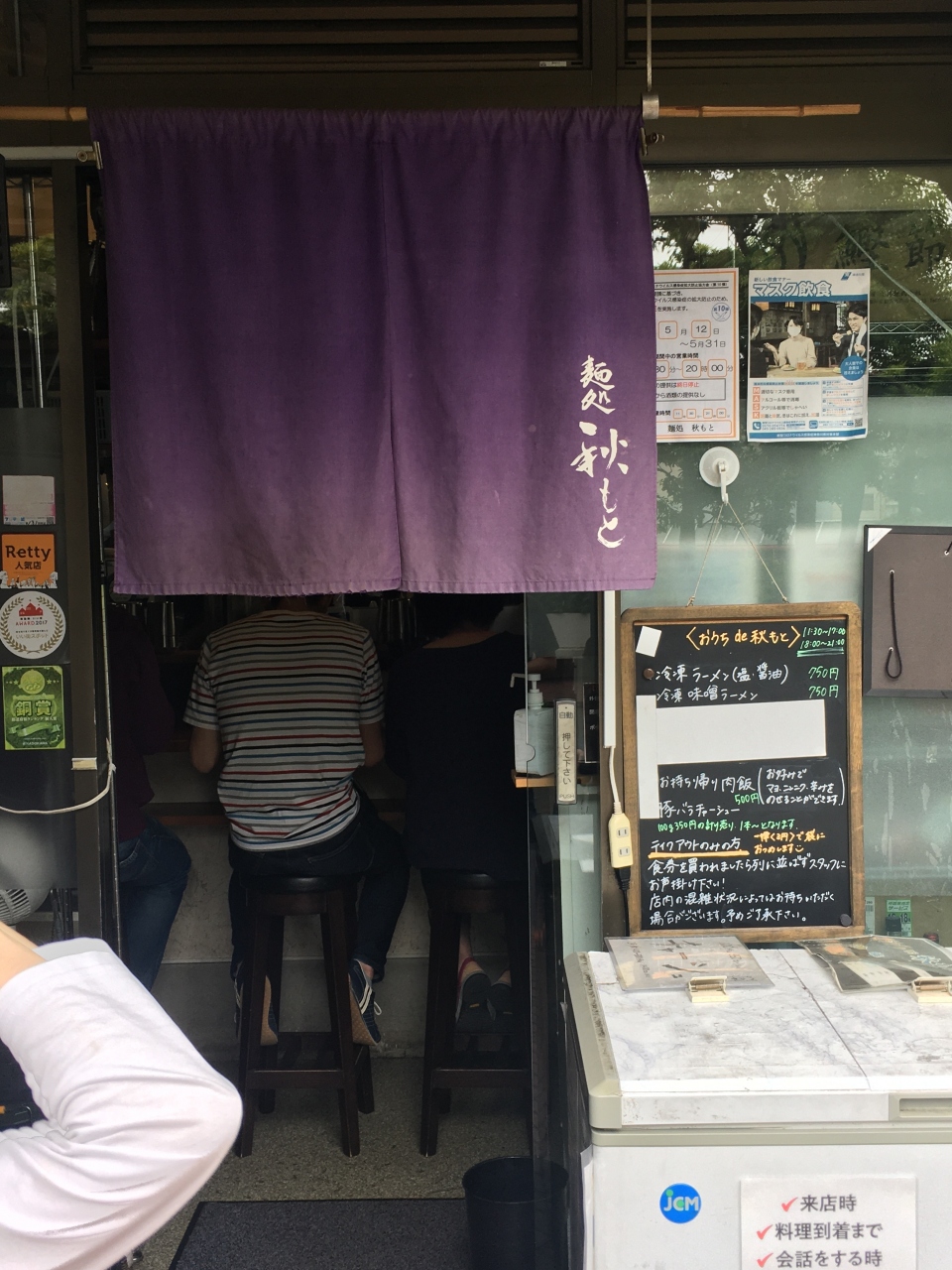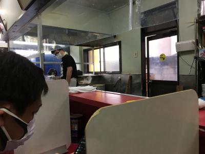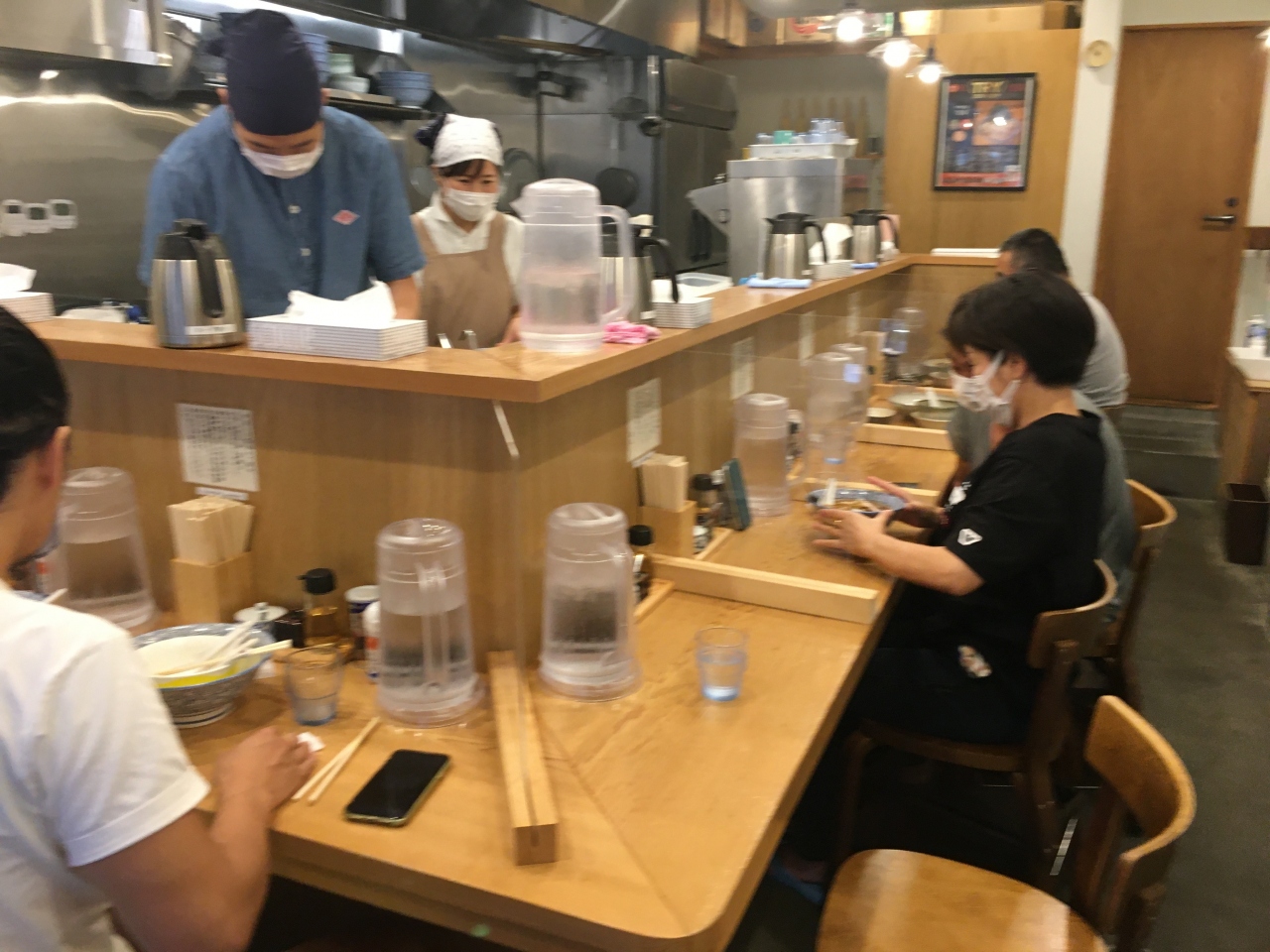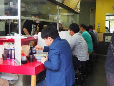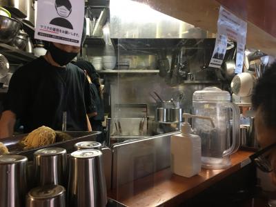 14時閉店直前に到着しましたが、平日にもかかわらず10数人待ちの行列、なかなかの人気店です。事前に食券を購入し並ぶこと10数分、カウンター13席あるので回転は悪くありません。コロナ禍ですのでカウンターは1名ずつ仕切られ、割り箸や調味料も個別です。
