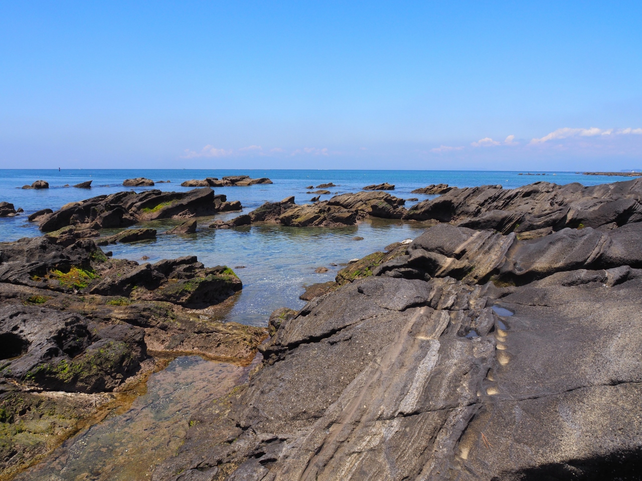 三浦層群と呼ばれる地層からなる海岸は程度な広さ。遠浅の岩礁が広がり、塩の干満にかかわりなく魚やエビ・カニ・貝類などの観察ができます。観察のため生物を捕獲することは可能ですが、その後は元に戻す必要があります。塩生湿地、斜交層理の海岸は変化に富んで、歩き回るだけでも冒険気分になります。そこに生息する様々な生物を追いかけ観察すると、時間があっという間に過ぎていきます。小さな子供たちが夢中になれる場所です。
