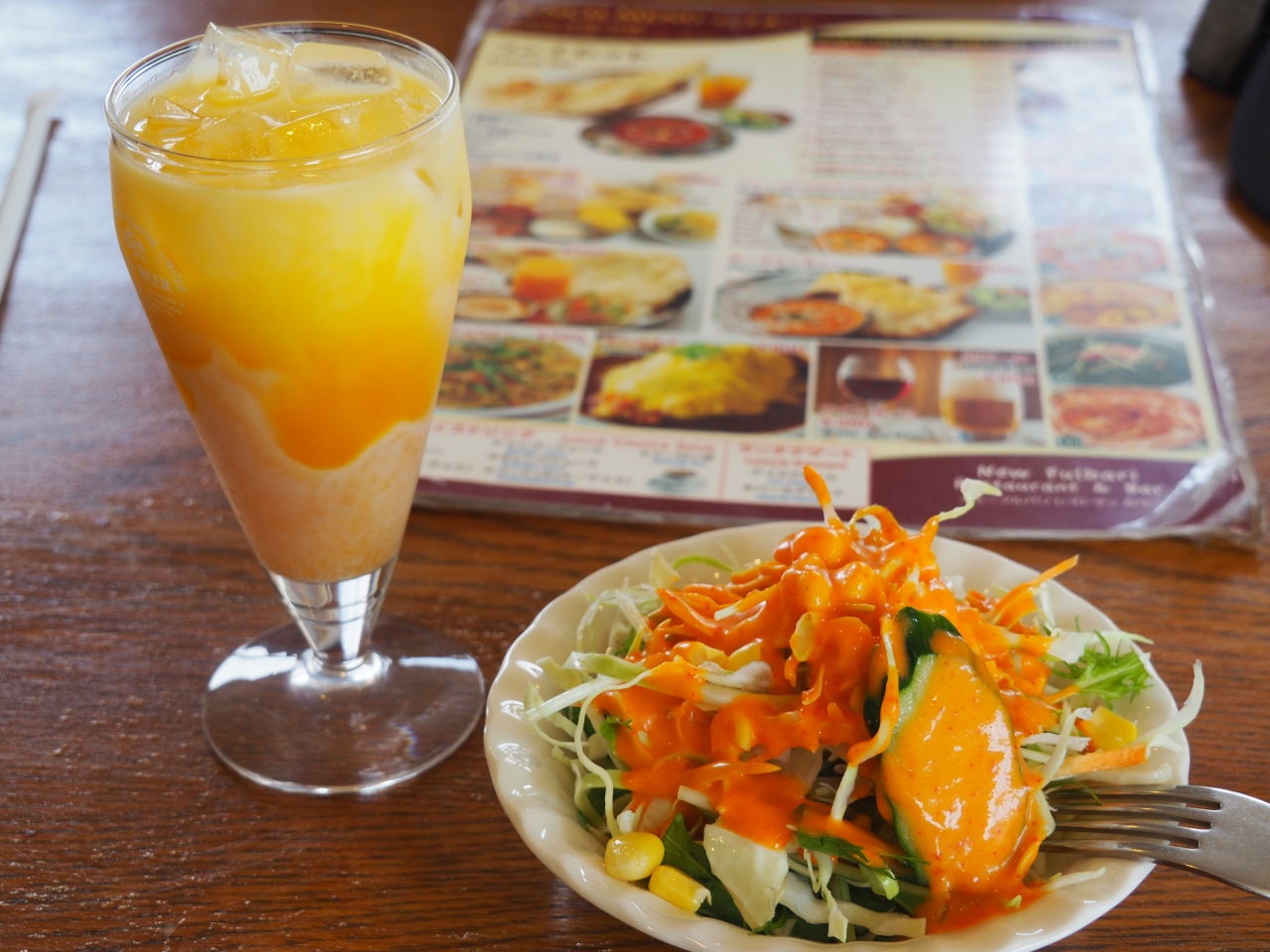 ランチセットのサグチキンカレー 880円をチョイス、中辛です。ナンはおかわり自由、サラダ、ソフトドリンク付きです。いつものようにマンゴーラッシーを頼みました。