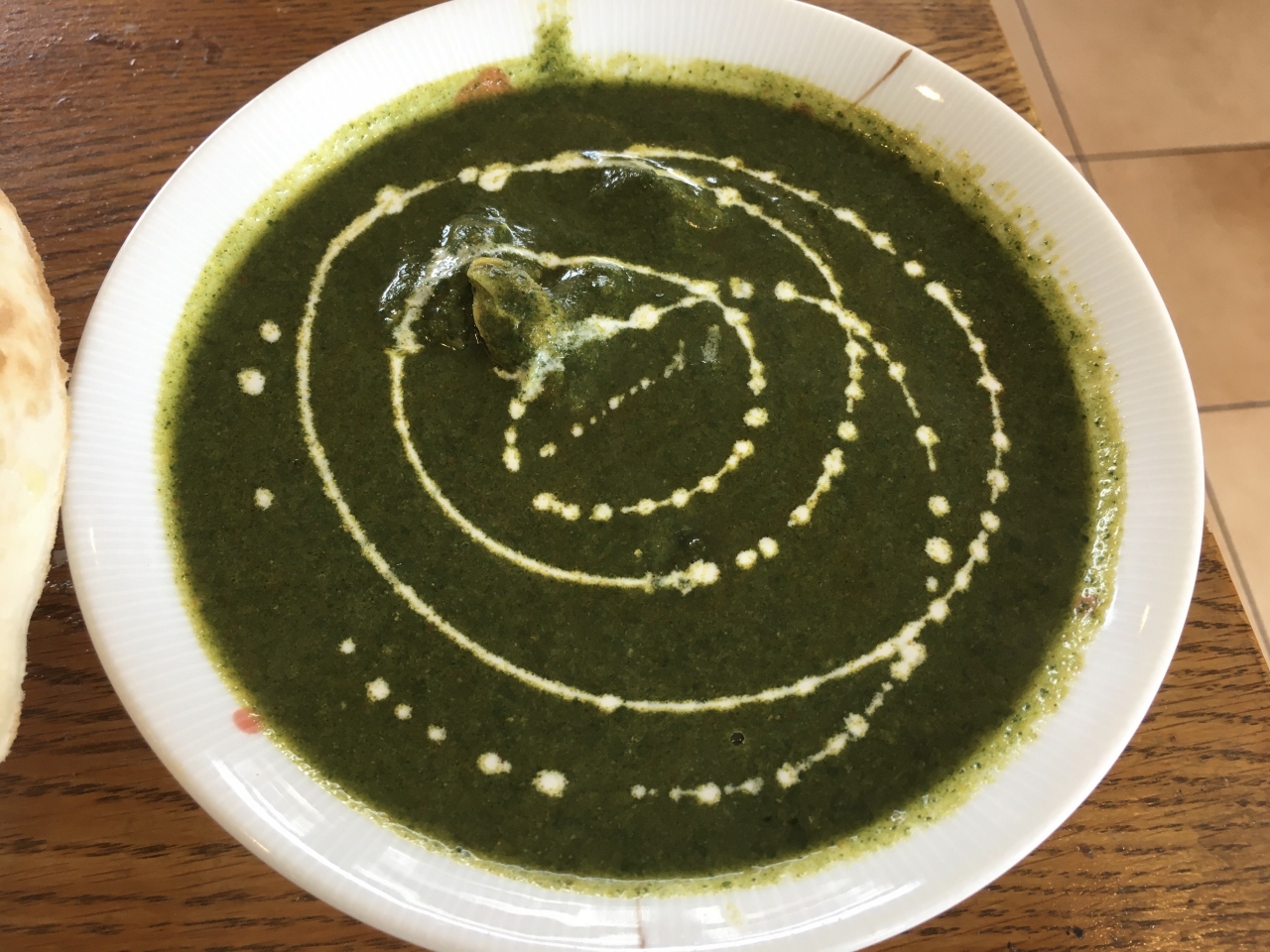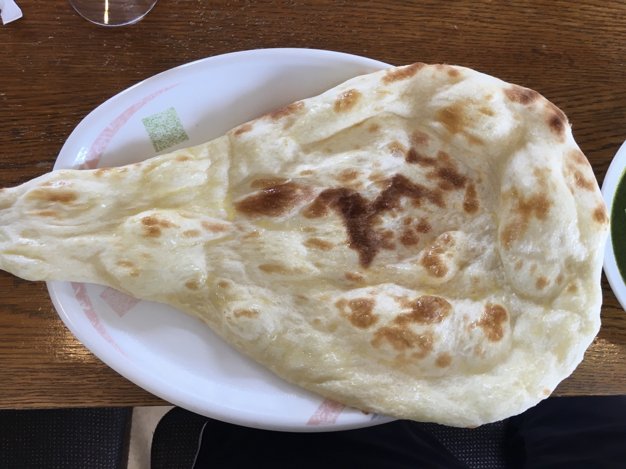 サグチキンカレーは初めてでしたが、ほうれん草とチキンがマッチして優しい味。ナンは皿からはみ出るほど大きく熱々、表面パリパリでとてもおいしかったです。