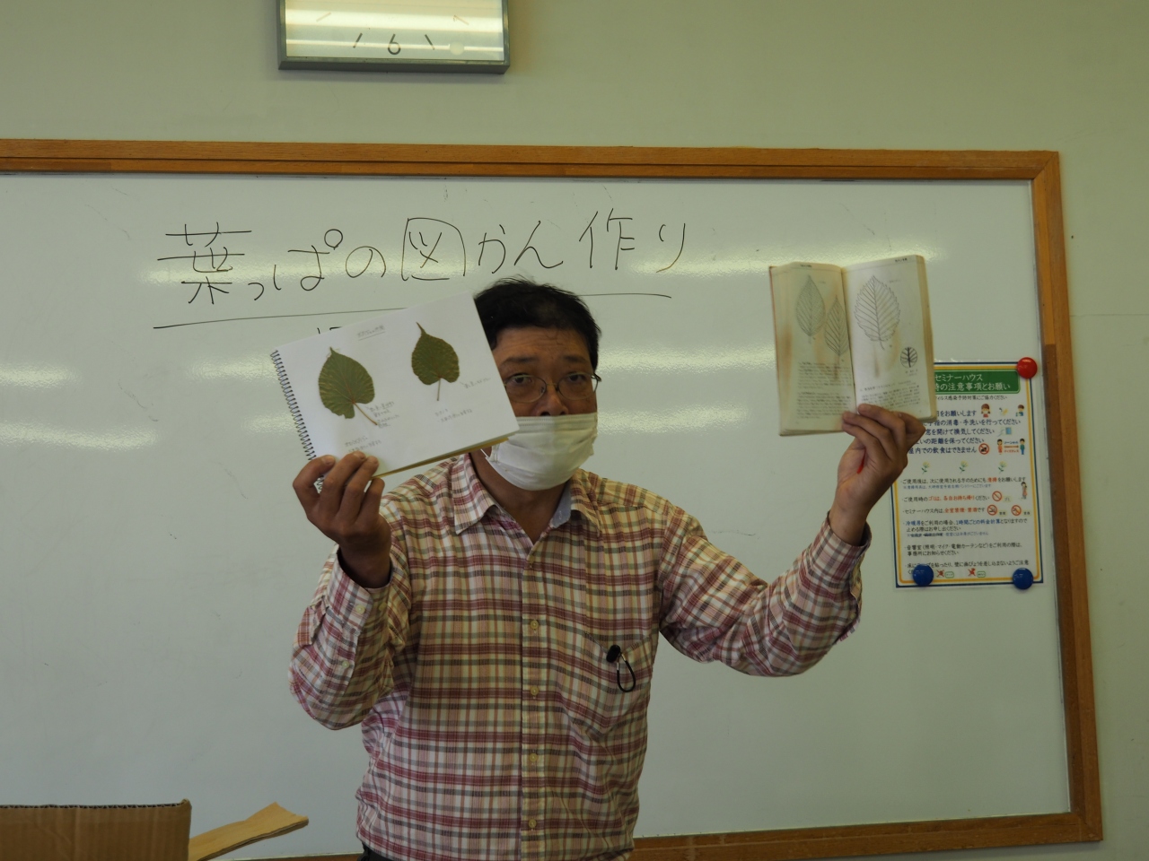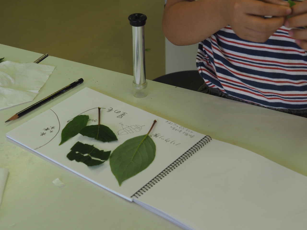 夏休みの孫たちを連れて葉っぱの図鑑作りツアーに参加しました。田中さとし先生がお盆の時期の日曜日の午前と午後の2回、毎年開催されている名物行事です。事前に電話で予約済みです。