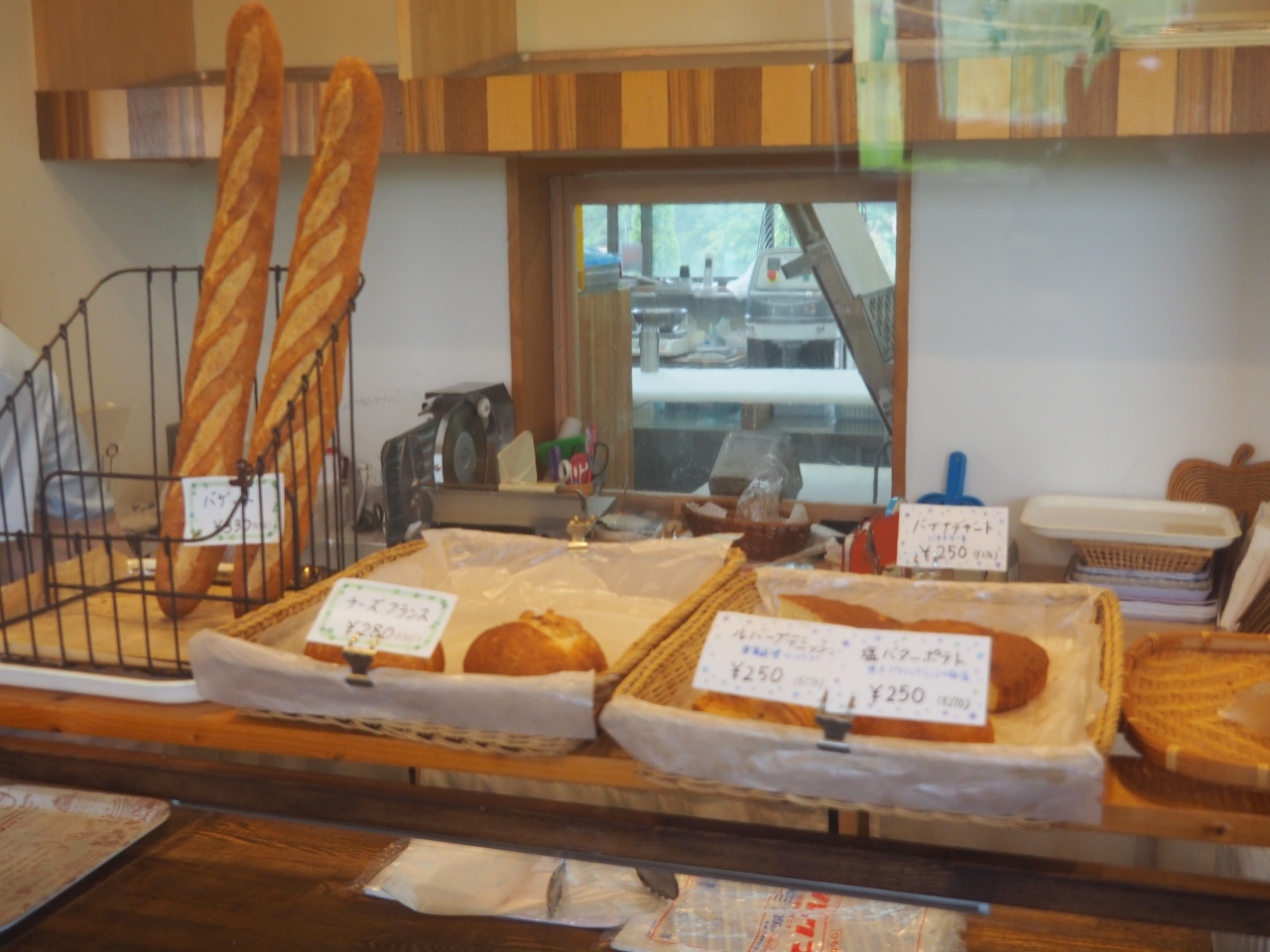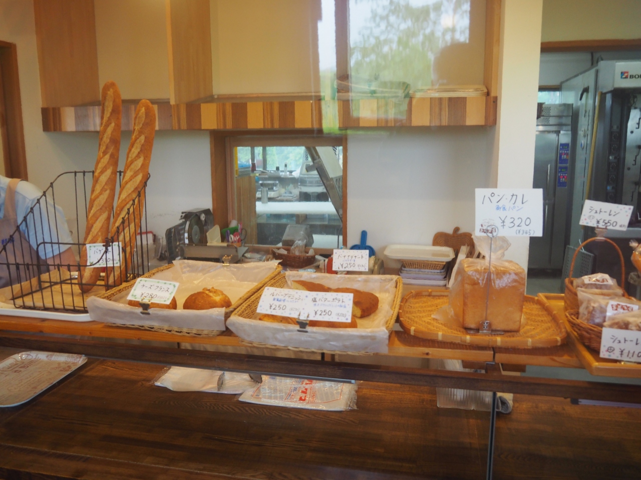 別荘では自分でパンを焼くので、パン屋に行くことはあまりありませんが、ある日通りがかると駐車場に何台もの車。興味が湧いて別の日の午後3時頃、空いているので立ち寄ってみました。こじんまりとした店内、奥にはイートインもあります。