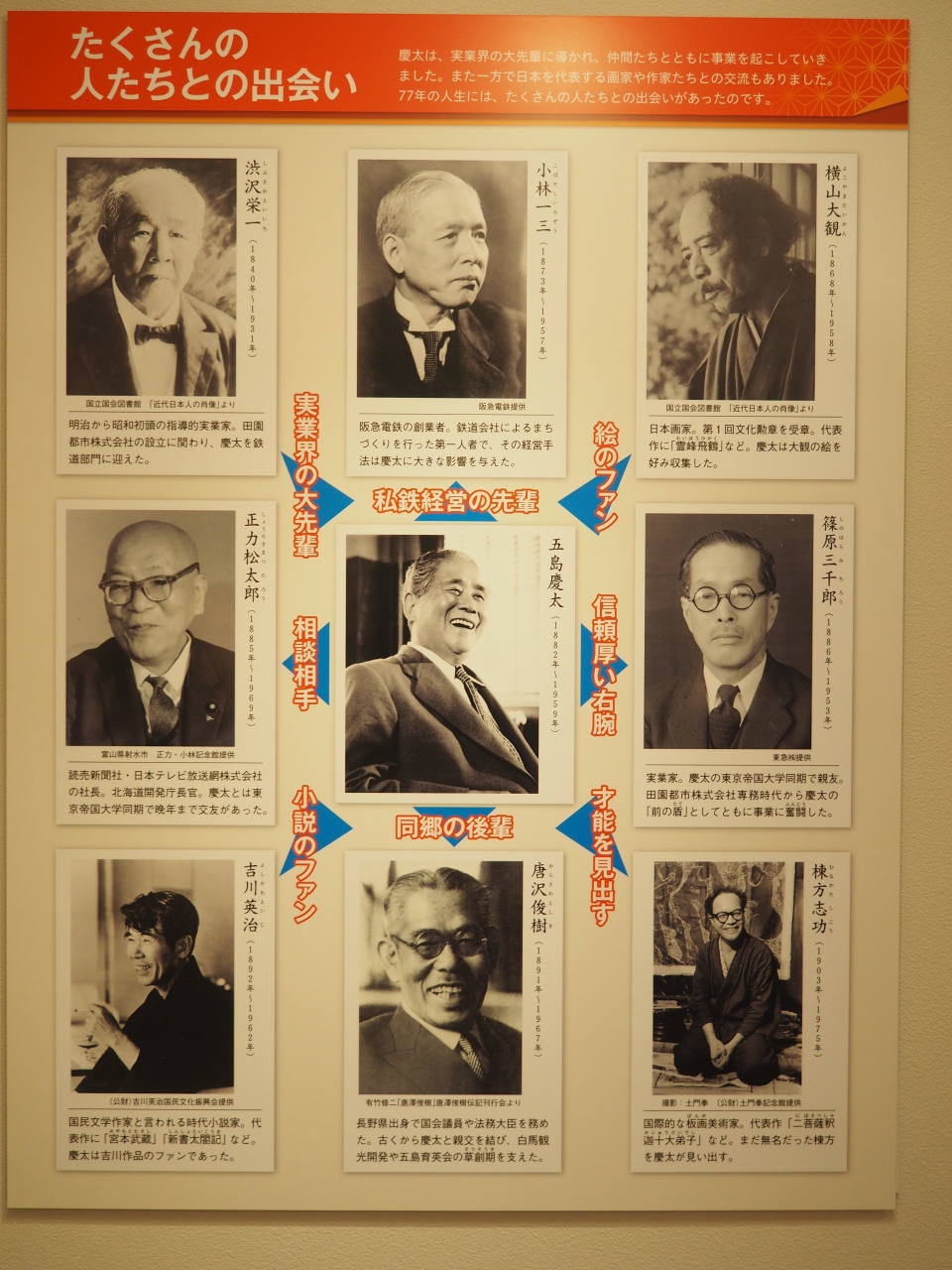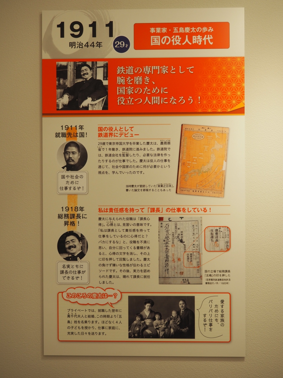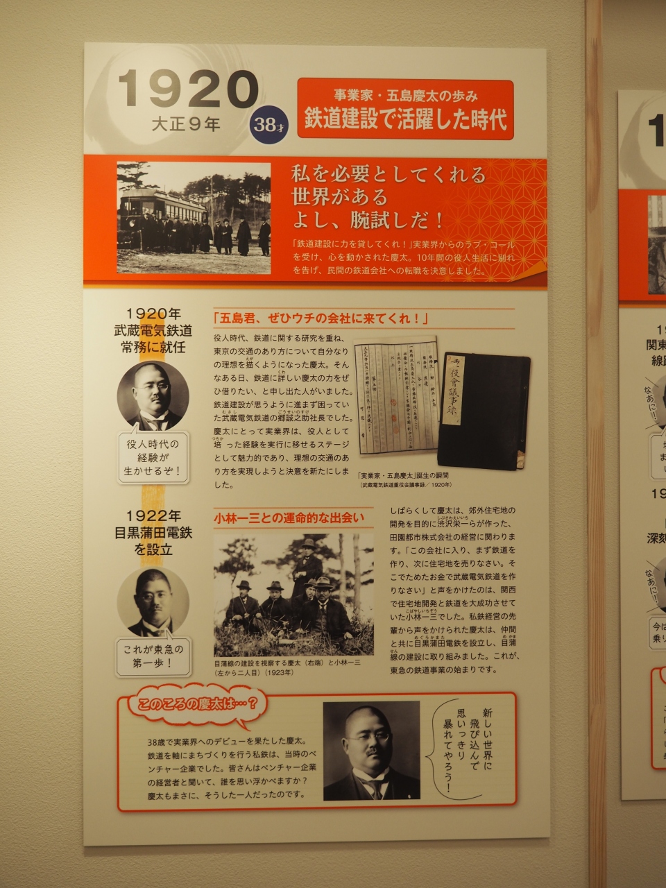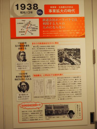 館内は五島慶太の生涯がわかりやすく詳細に展示されています。貧しい農家に生まれ、両親に頼み込んで進学した上田中学校へ、片道12km、徒歩2時間の道のりを1日も休まず歩いて通ったエピソードが胸を打ちます。その後も苦学して東京高等師範学校、東京帝国大学に進学、小林一三(阪急電鉄の創業者)や渋沢栄一の知遇を得て、苦難の末、東急電鉄を育て上げた生涯が克明に物語られています。