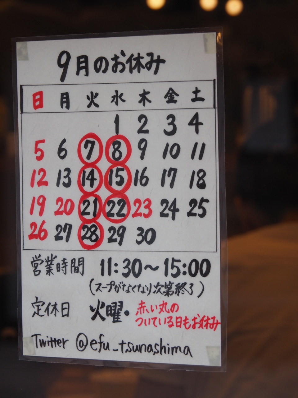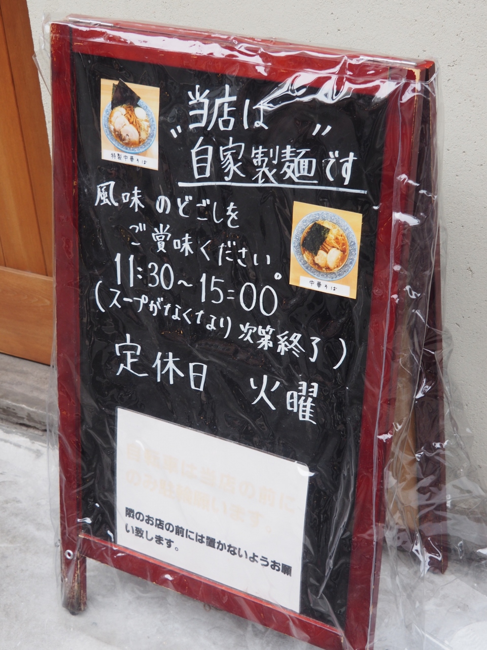 港北散歩の途中で訪れました。綱島駅から750m、徒歩9分。路地裏の不便な立地にも拘らず、平日の12時半頃到着した時にはすでに9人待ち、20分ちょっと並んで入店です。カウンター8席、若い夫婦2人が経営する小さな店です。