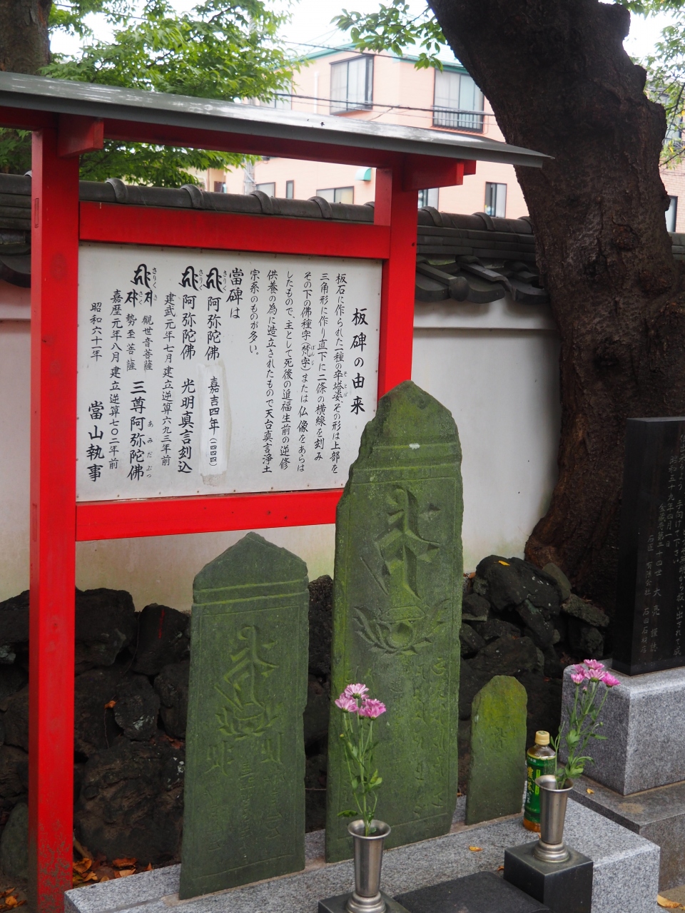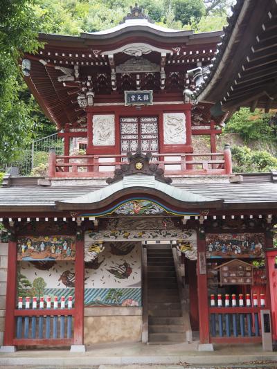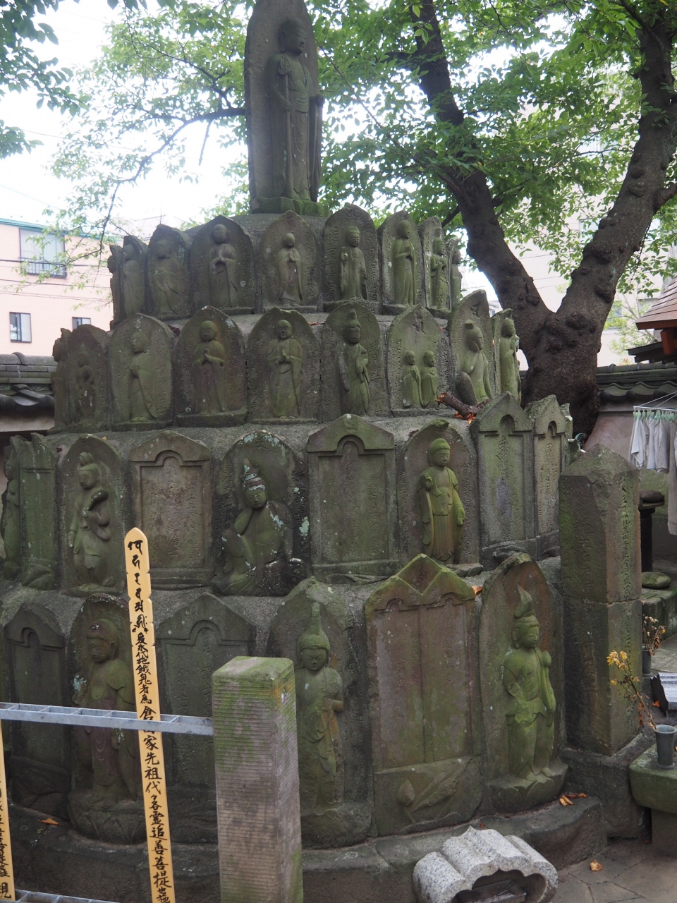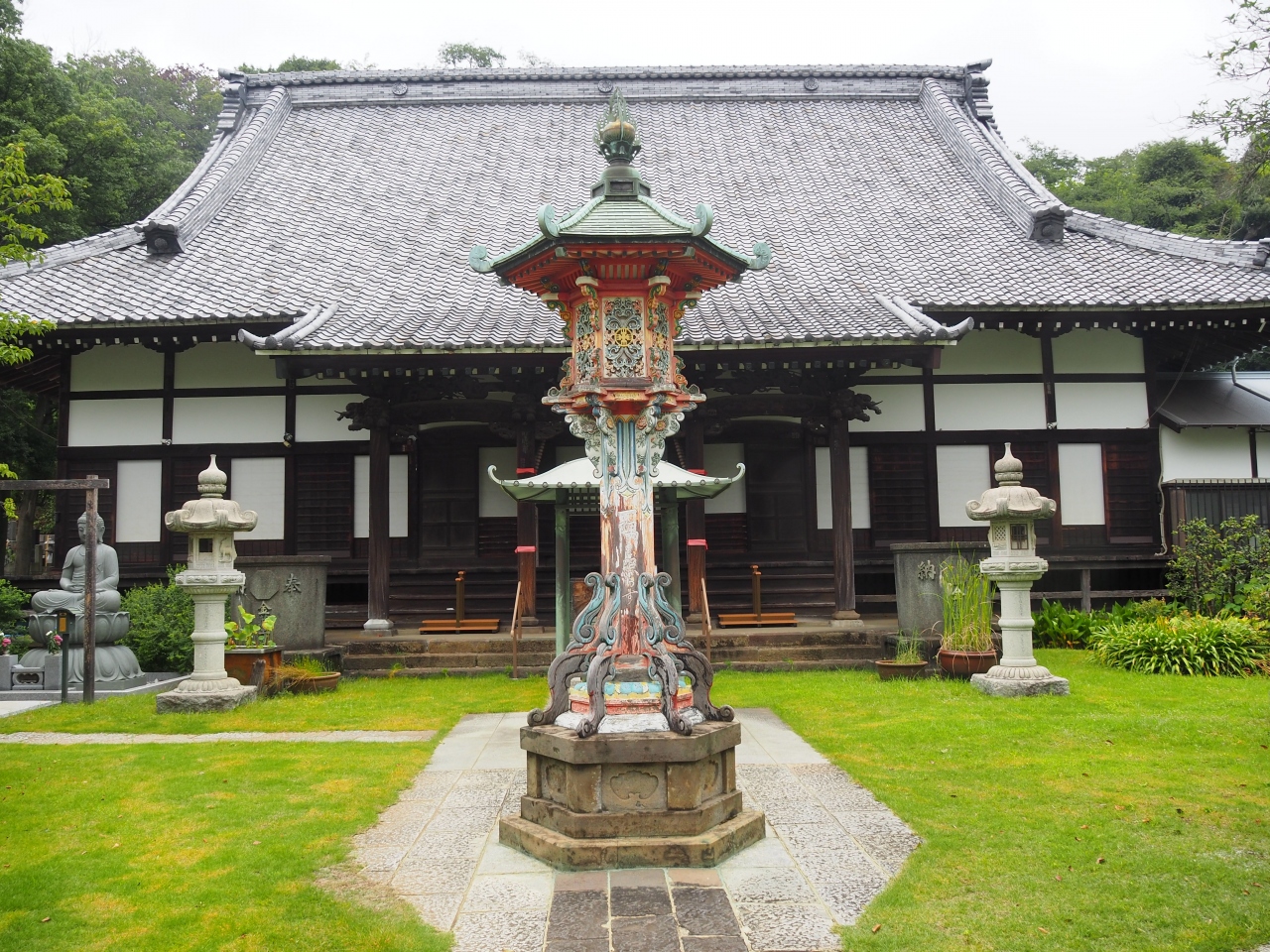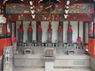 そんな謂れより驚くのは、境内あちこちに建てられた極彩色のお堂。燈籠、六地蔵尊、弁天堂、水盤舎に始まり、背後の山沿いの奥の院には奥之院弁財天、不動明王、日吉山王権現などカラフルなお堂が連なっています。その多彩さは東南アジアの仏教寺院を思わせます。他にも板碑や五重層石仏塔など珍しい石碑・灯籠の類が林立しています。どのような経緯でこのようなお寺になったのか、知りたいところです。