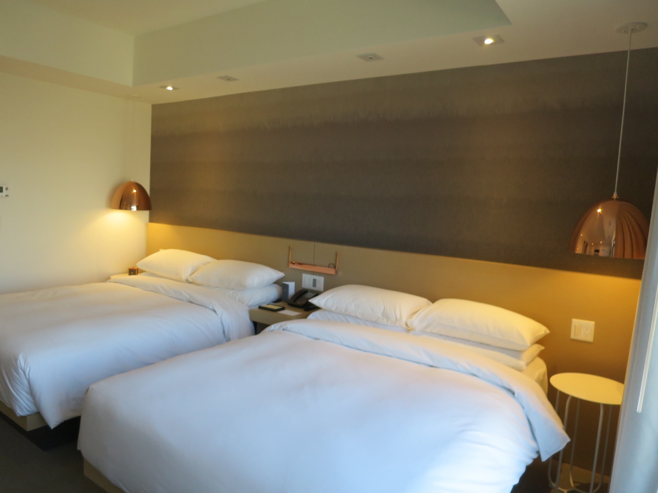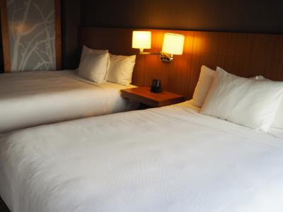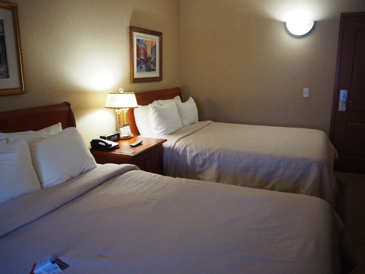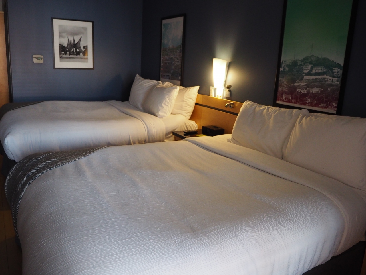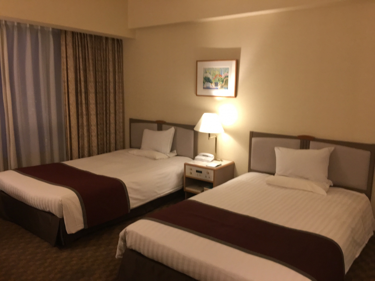 部屋は十分な広さ、クイーンベッド2台のツインルームでした。設備やアメニティは豪華さはありませんが、丁寧に掃除され、清潔で必要十分なものが揃っており不満はありません。唯一、セーフティボックスがないのが難点です。日本人客には日経の朝夕刊、外人客には英字新聞が投入されます。