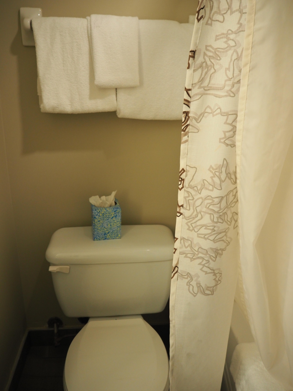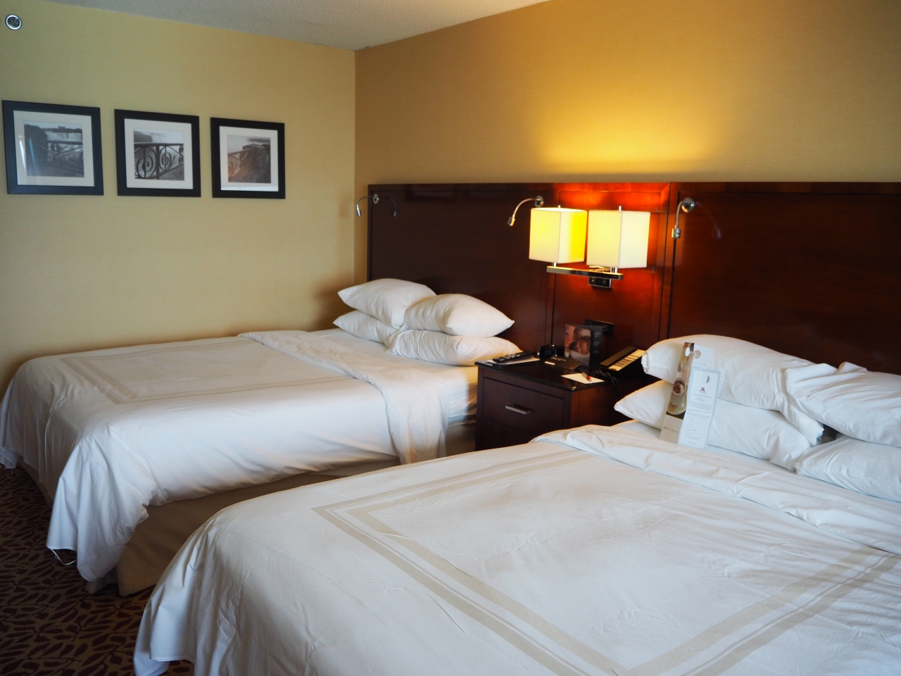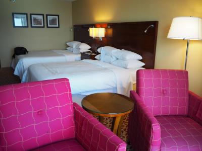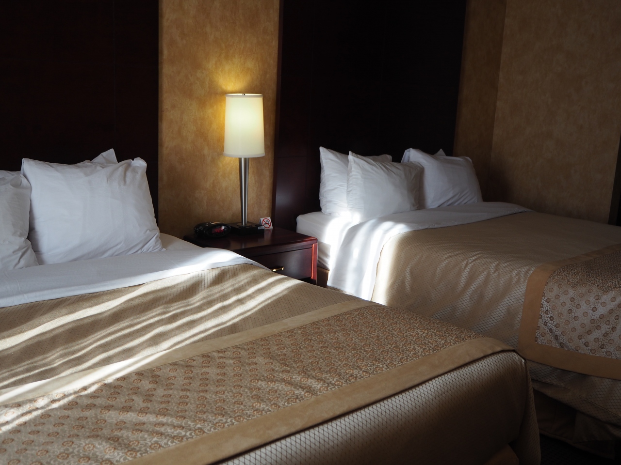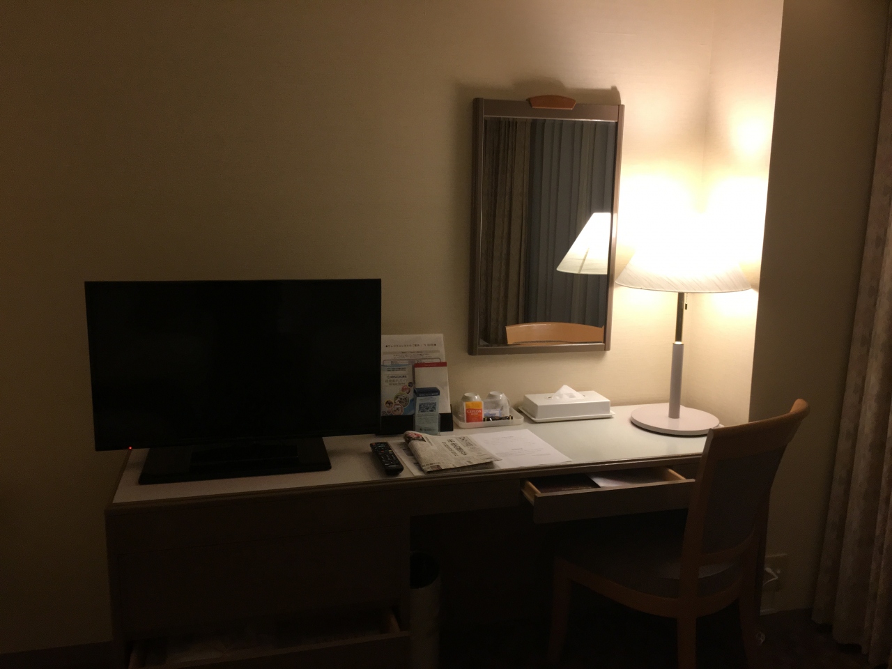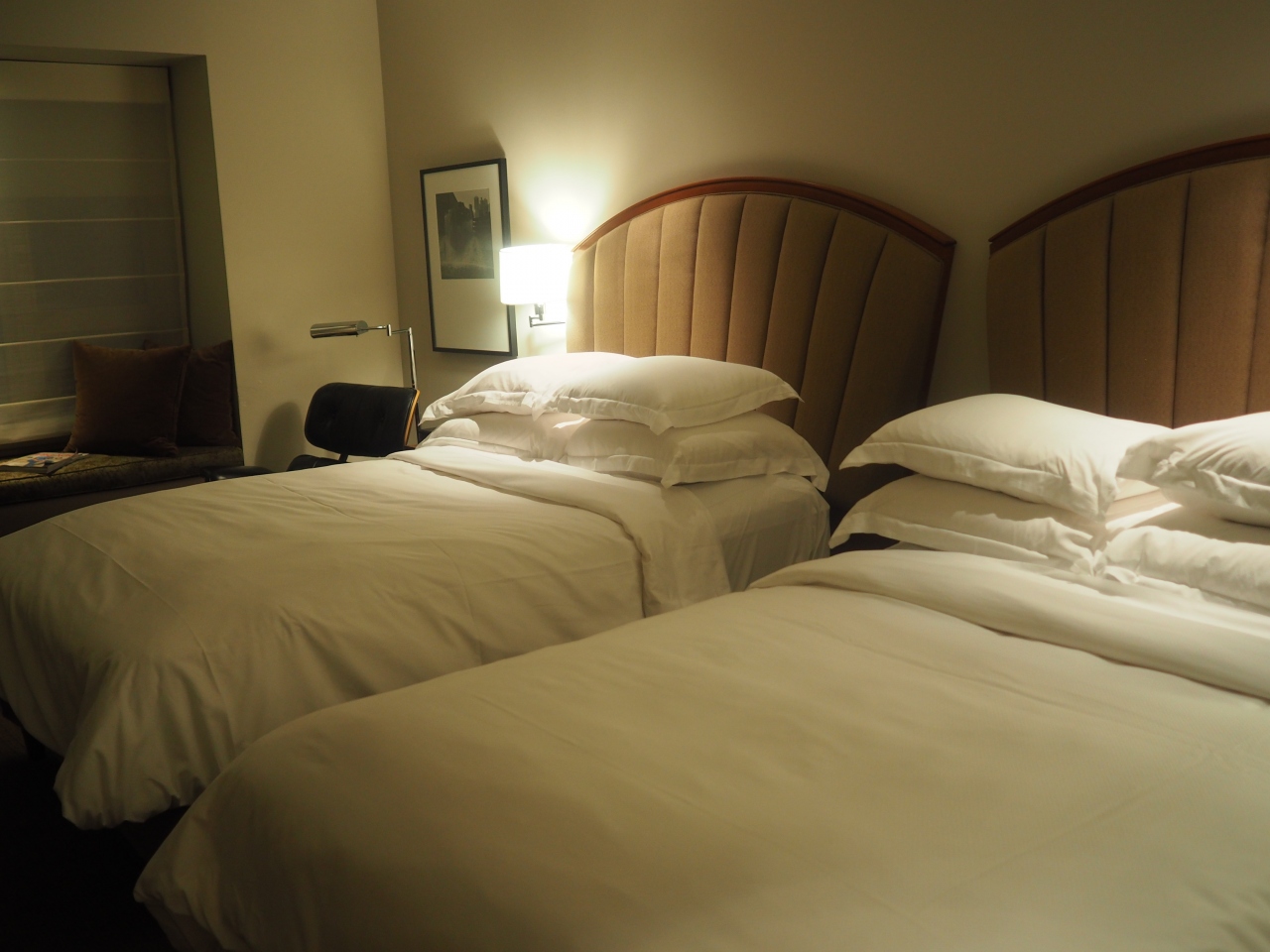 部屋は十分な広さ、クイーンベッド2台のツインルームでした。設備やアメニティは豪華さはありませんが、丁寧に掃除され、清潔で必要十分なものが揃っており不満はありません。唯一、セーフティボックスがないのが難点です。日本人客には日経の朝夕刊、外人客には英字新聞が投入されます。