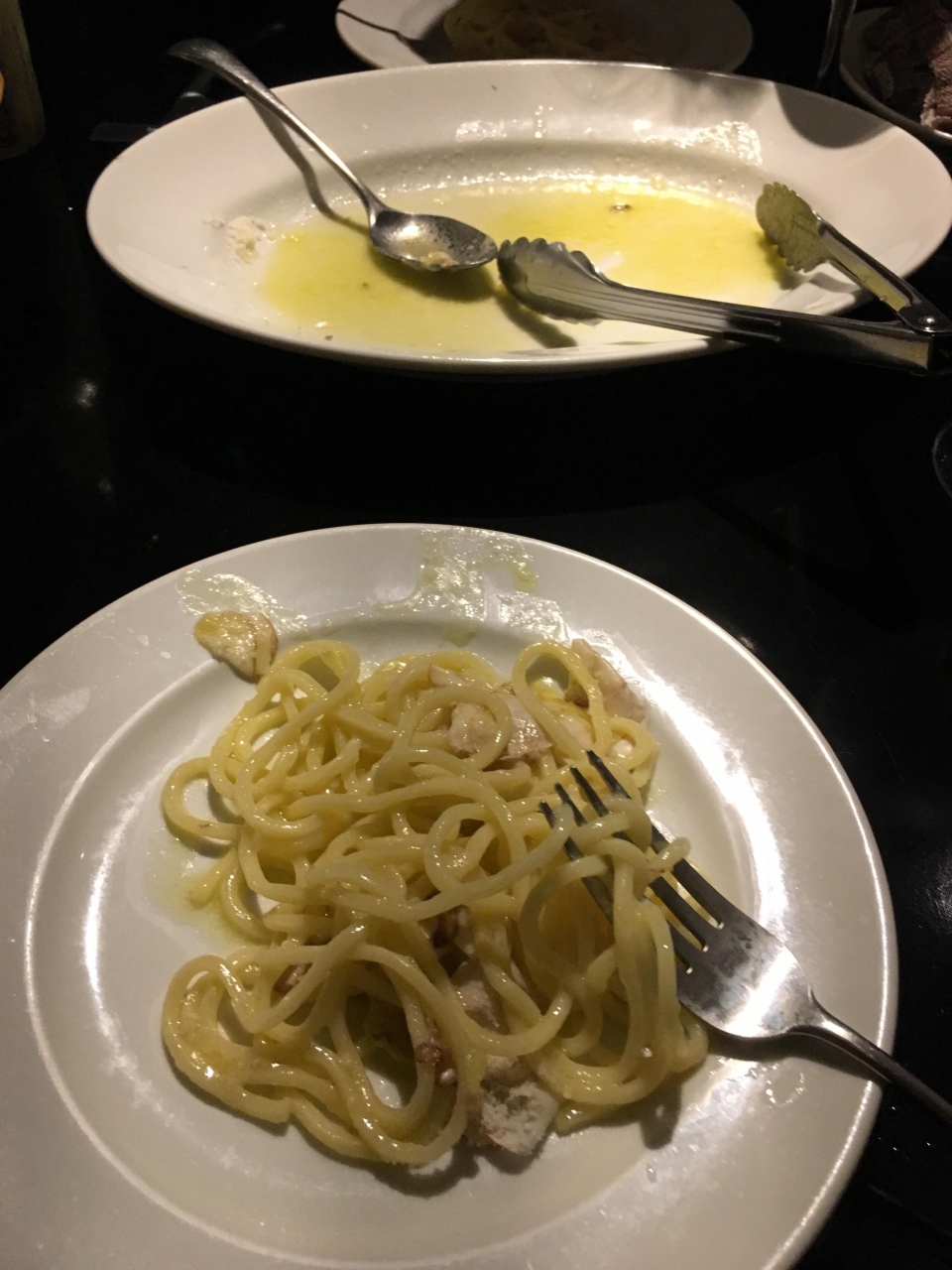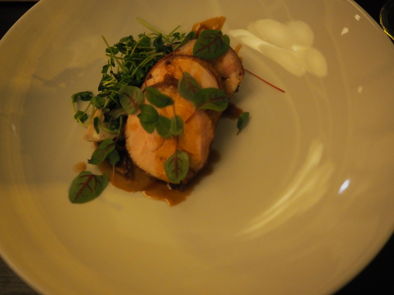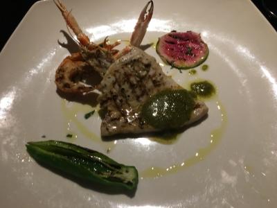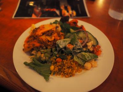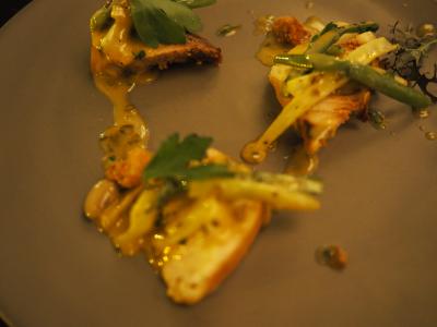 なんとかトルテリニ(パスタのお茶漬け?)、ペセスパダ(カジキの串焼き)、コーニッシュ・ヘン(小型鶏のロースト)にグラスの白ワインをオーダーしました。
