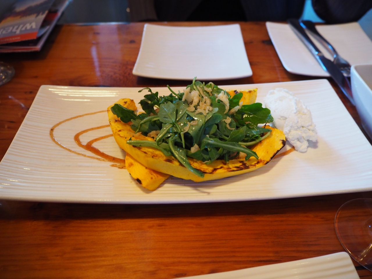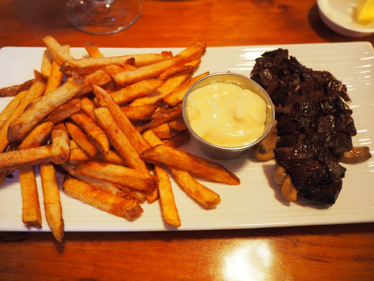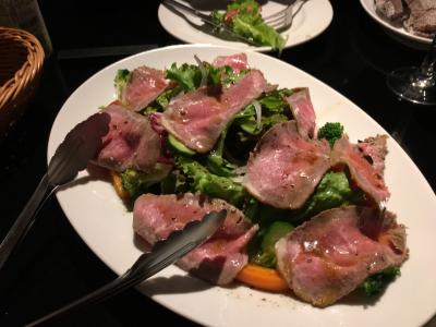 パンプキンサラダをシェア、私はポークベリーのロースト、妻はフィレステーキ、たっぷりのフレンチフライ。どれも美味しく日本人の味覚にも合います。
