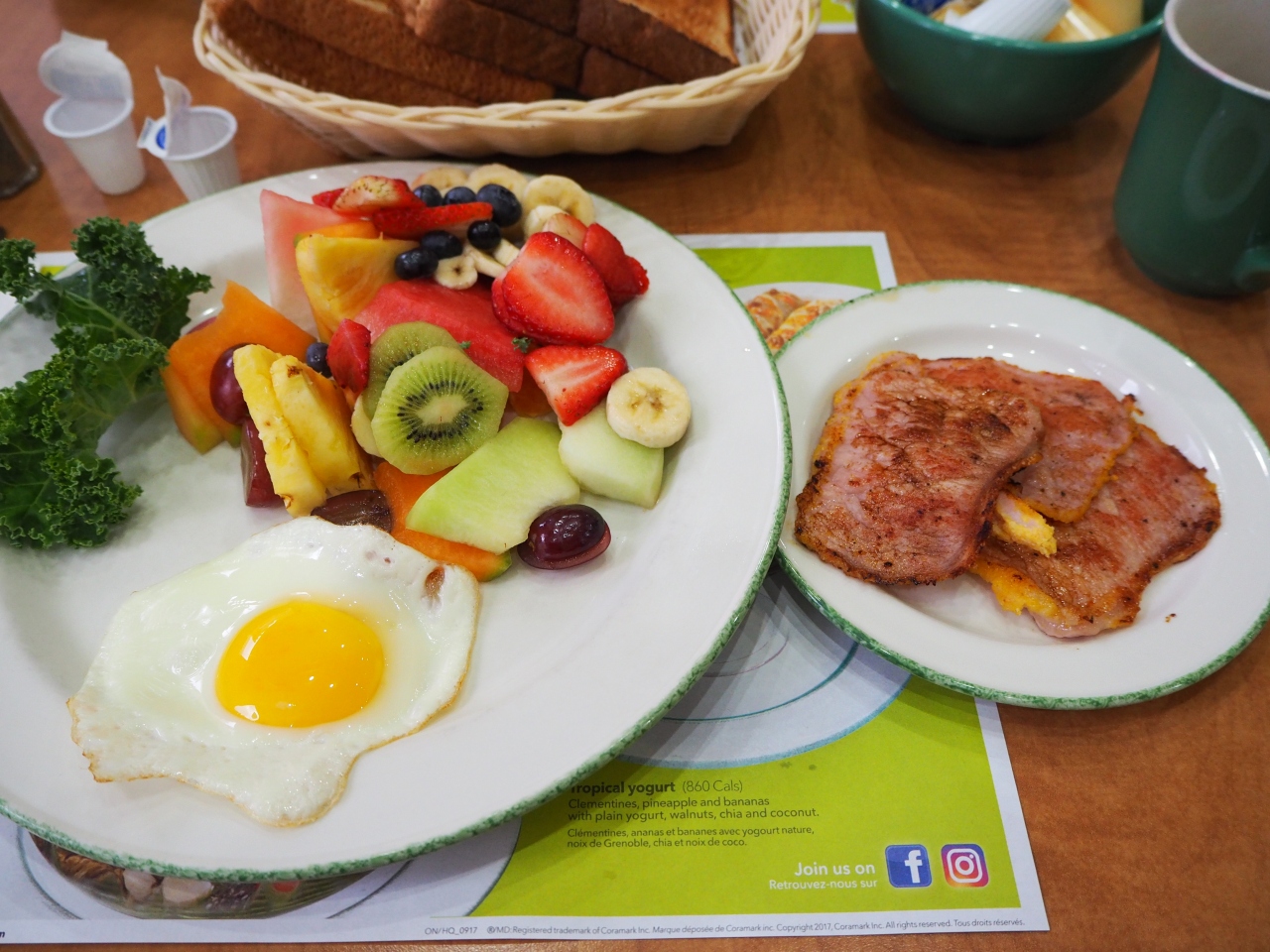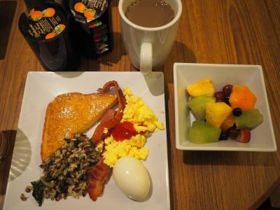適当にオーダーしたらこれらがなかなかに美味しい。フルーツもたっぷりで贅沢な朝食です。豊かなカナダの朝食を味わえます。値段も割安で満足です。