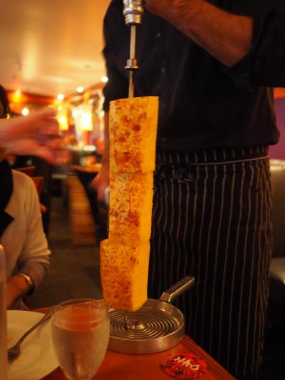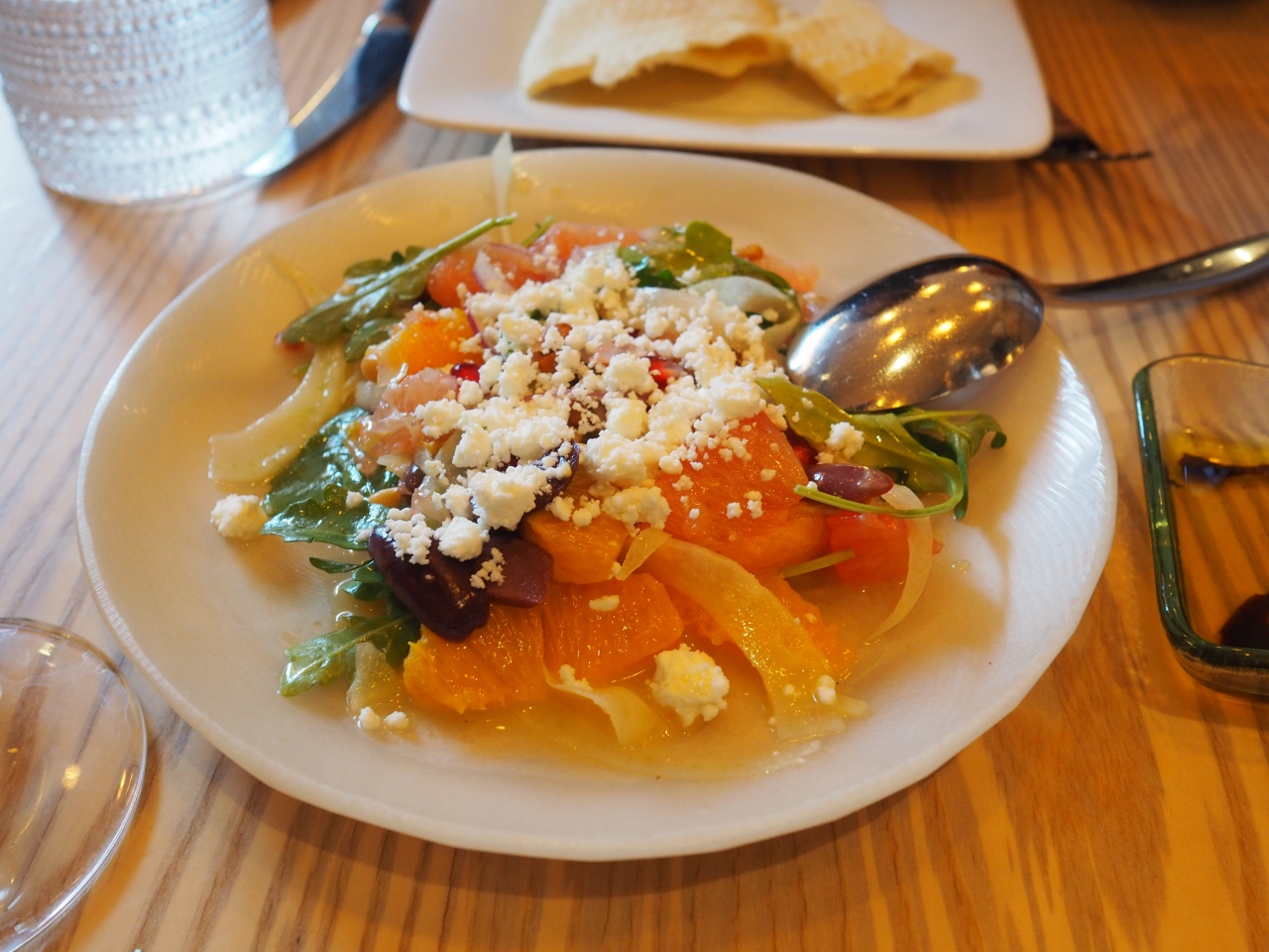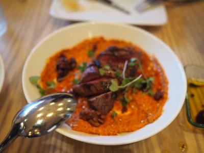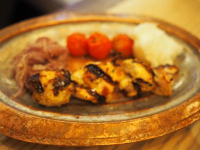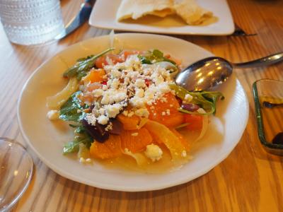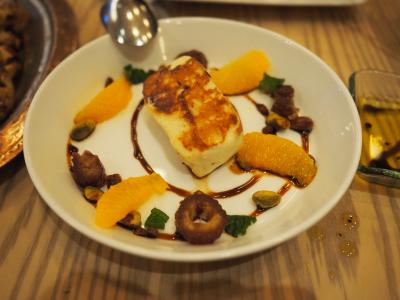 スタッフにどんな料理かと聞いたら、ギリシャ・トルコ近辺の小皿料理とのこと。ならばと適当に5〜6品を注文しました。オレンジサラダ、ホタテのザジキ(トルコ料理)、ステーキ・ムハンマラ(シリア料理)、シッシュ・タオーク(マリネしたチキンのケバブ、中東料理)、ハルーミ(非熟成塩漬けチーズのグリル、キプロス料理)など。