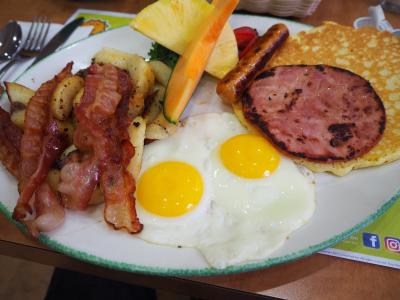 朝食付き、メニューは限られますがワッフルも焼け悪くありません。