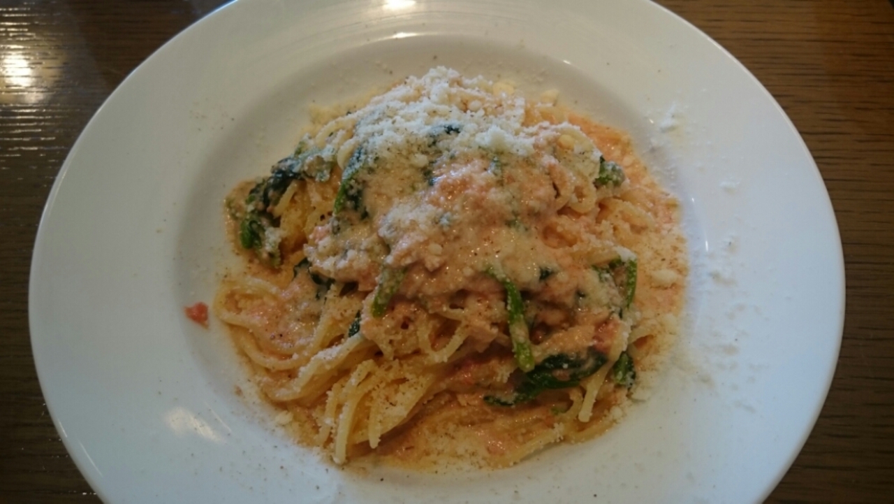 ランチは何種類かあり、ツナとホウレン草のトマトクリームソースパスタをオーダー。適度な酸味とまろやかさで美味しいです。ボリュームもややしっかりめ。