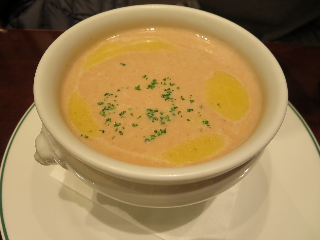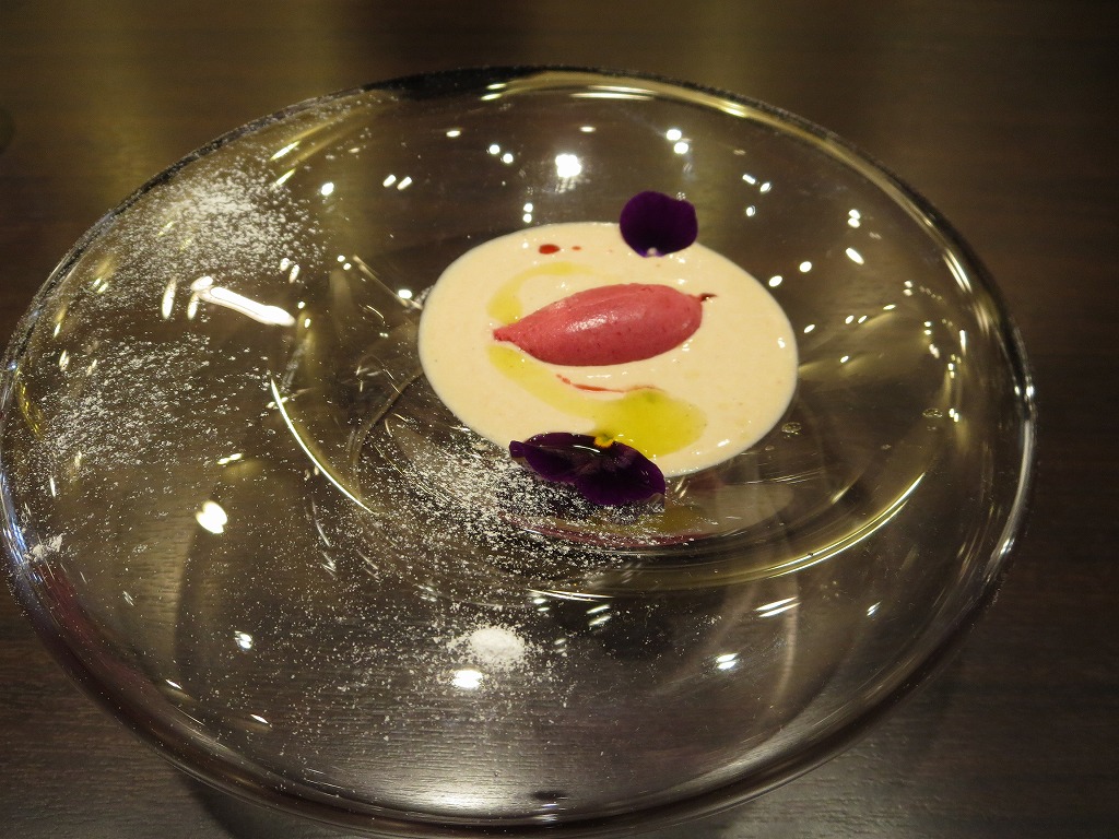 アミューズは、マロンのスープにフランボワーズのアイスクリーム添え。マロンのスープがびっくりするほど美味しかったです!濃厚なのに後味さっぱりのおしゃれな味わい。