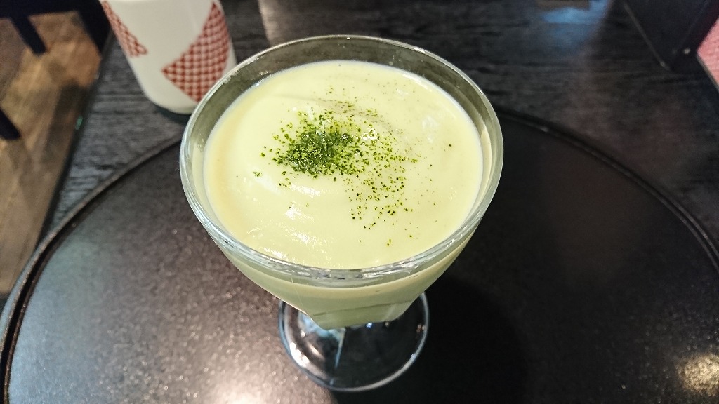 寒天シェークという珍しいものがあったので、これをオーダー。宇治抹茶味と北海小豆こし餡味があったので前者をチョイス。