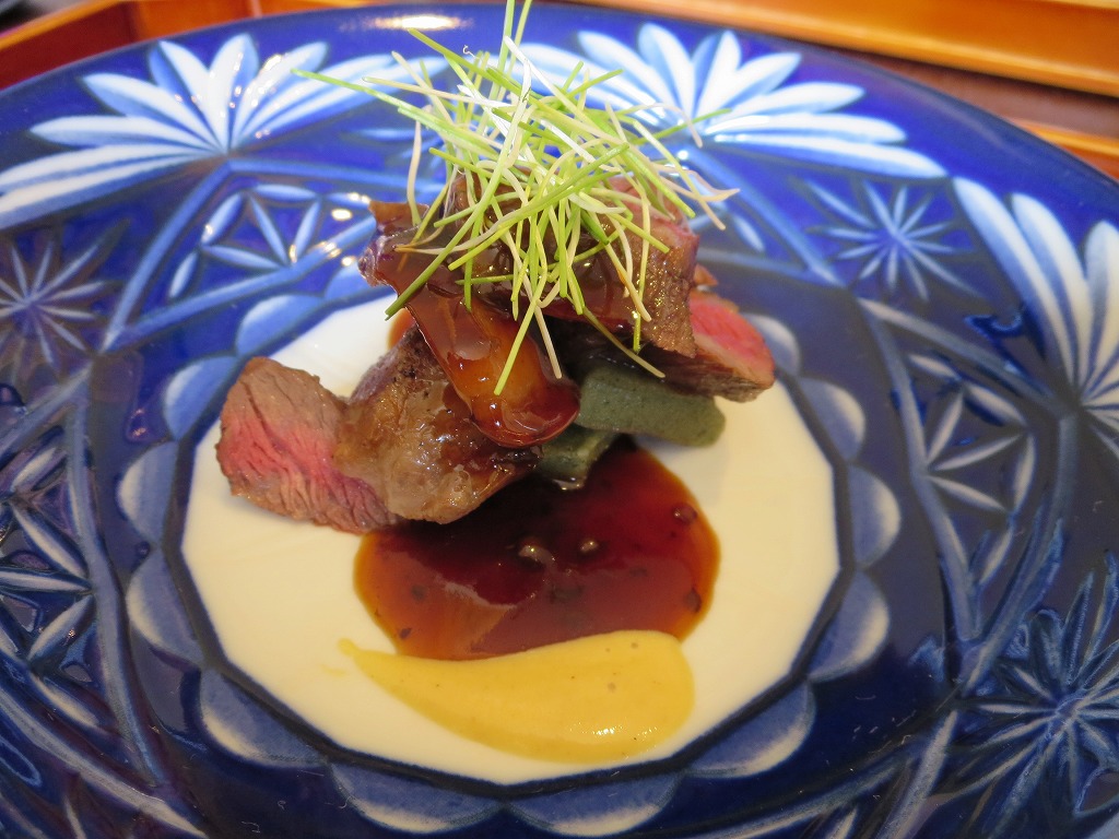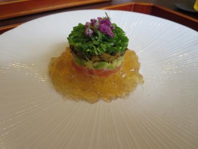 何といっても感激したのは、お口取りの「蒸し鮑と筍のミルフィーユ風」。細かく刻んだ鮑と筍、スモークサーモン、アボカド、ジュレが重なり合い、見事な調和を生んでいます。見た目も美しいですが、その期待に違わぬお味です。以降のお料理もすべて、深く洗練された味わい。