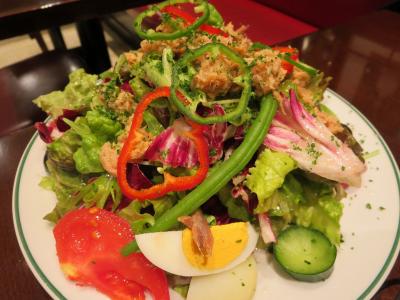 ニース風サラダ、フレンチフライ、本日のスープ、スモークサーモン、ピクルス、バゲットをオーダー。それぞれのボリュームがすごいので、コスパは良いです。全体的に脂っこくなくさっぱりしているのが嬉しい。