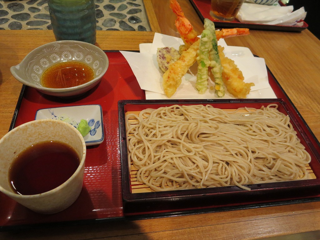 オーダーは、ざるそば、大えび天せいろ、ゴマだれ豆腐サラダ、アヒポケ。