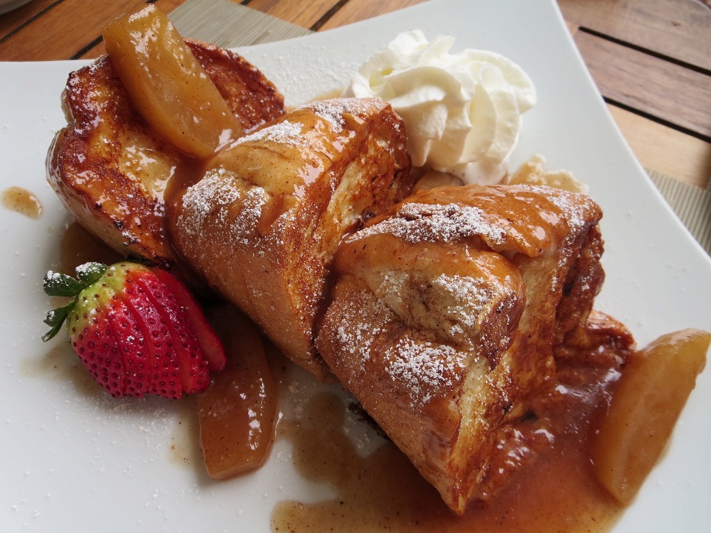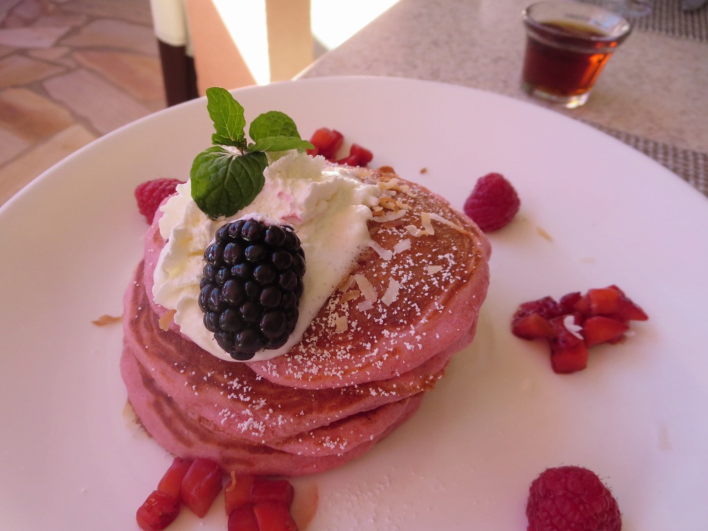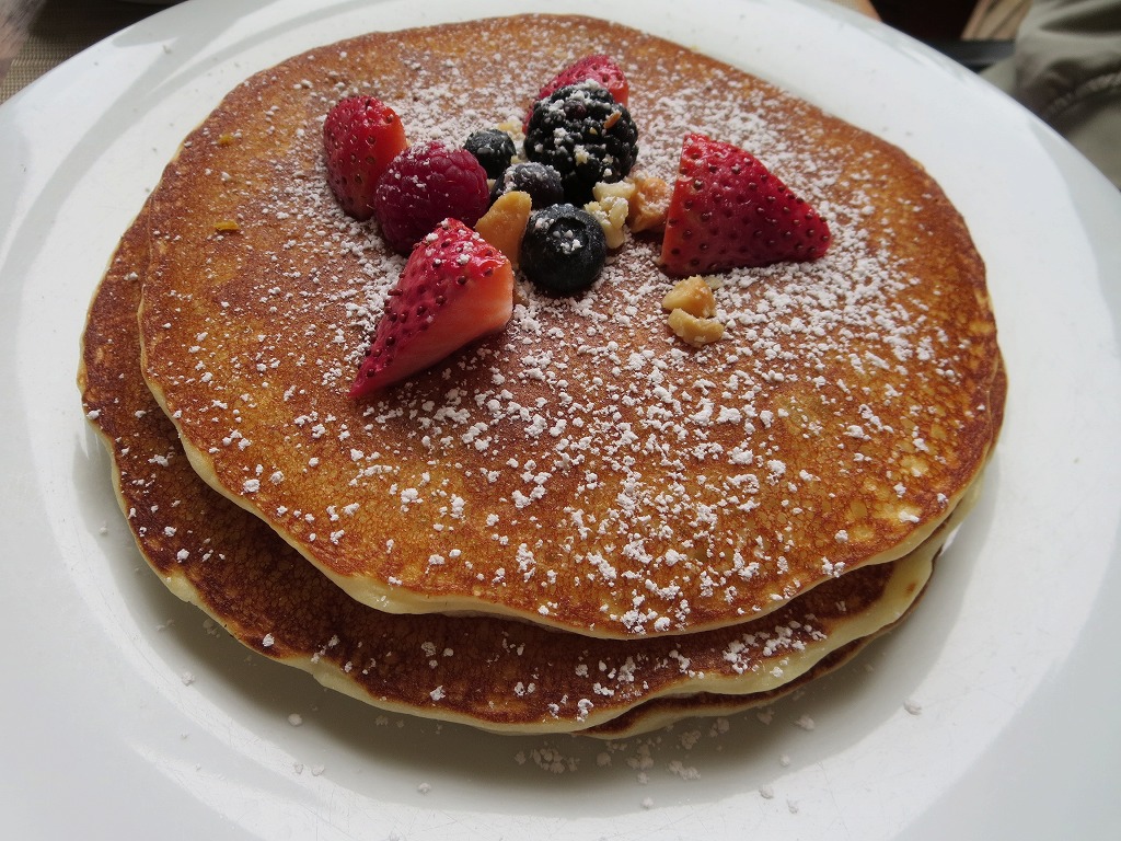 ブッフェは、メイン料理とジュースを1つオーダーできるシステム。メインは2人で、パンケーキと蟹のオムレツで決定。パンケーキはとにかくビジュアルがかわいい!蟹のオムレツ、美味しかったです。オムレツ用のケチャップは、かわいらしい小瓶がまるごと1つ提供されます。太っ腹!隣のテーブルでは、タバスコの小瓶が提供されていて、これまたかわいい。