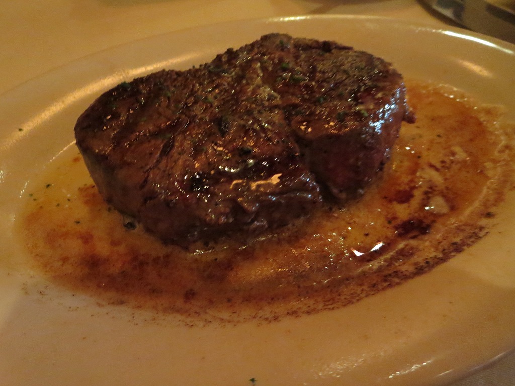 写真は、ステーキハウスサラダ、ミニフィレのミディアム、マッシュポテトとほうれん草のクリーム煮(2人で1つずつ選んだもの)。