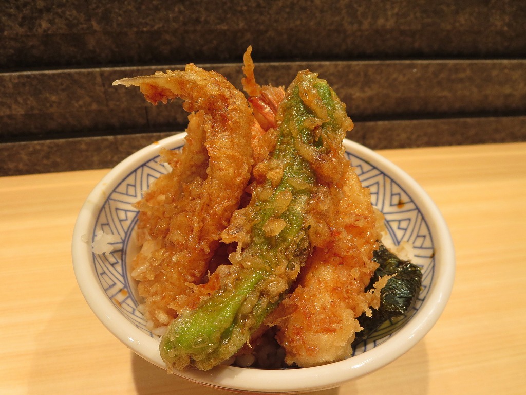 天丼(竹)をオーダー。天ぷらもたくさん載っていて、ご飯にかかるタレの具合もちょうど良いです。