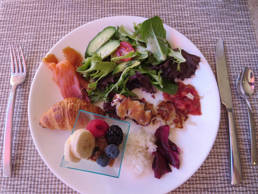 その他のお料理はピックアップしに行きます。サラダやワッフル、卵料理、ソーセージ、ベーコン、スモークサーモン、白米、お漬物、お味噌汁、グラノーラ、パン・デニッシュ類などなど。白米はジャスミンライスっぽい感じでした。お味噌汁はお出汁がきいています。