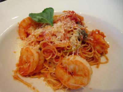 写真はエビのトマトソースパスタ。味付けはややしっかりめながらバランスよく美味しいです。