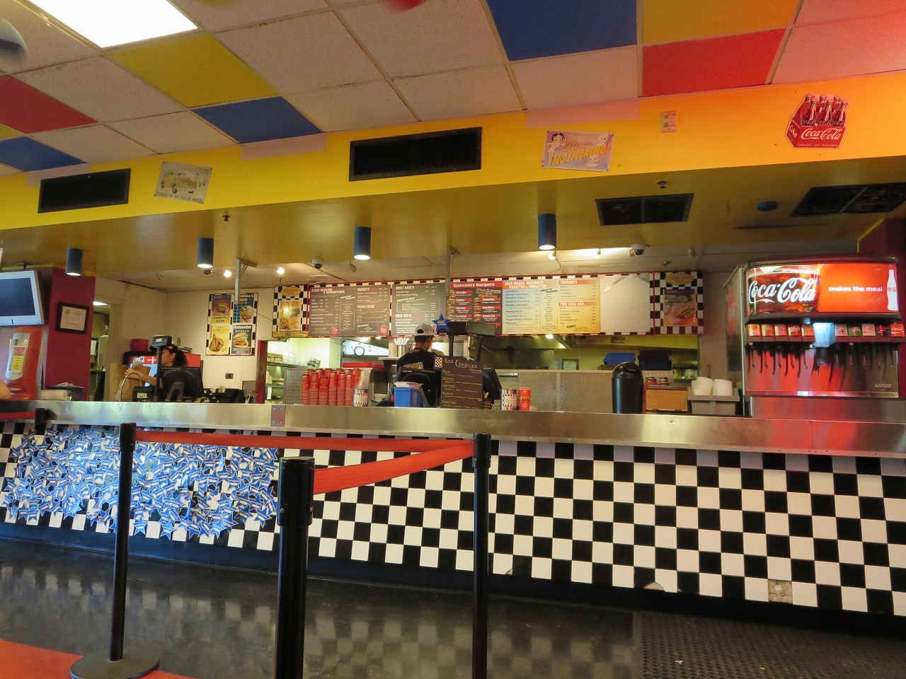 お店は、グルメバーガーというより完全ファストフード。照明暗めな店内は、ローカル感が漂います。お店のスタッフの方が、きびきび働いていて、有名店の誇らしさがあります。