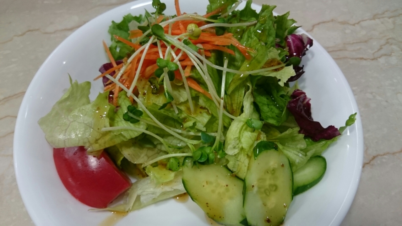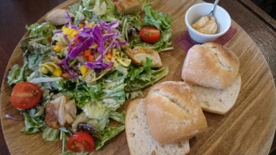 チョイスはサラダランチ。たっぷり野菜とチキンのグリル(小さくカットしてあります)、パンがワンプレートになっています。ドレッシングはごまで、割とたっぷりめ。美味しいけれどよくある?という感じです。