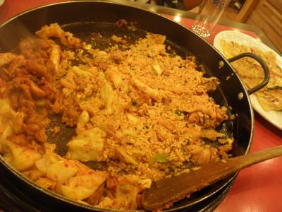 各テーブルの鉄板で、ダッタンカルビ、キャベツ等の野菜、そしてごはんを投...