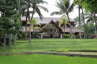 敷地にはヴィラが点在していて中央には田んぼがある、その先にレストランがあり朝食はそこで頂く。