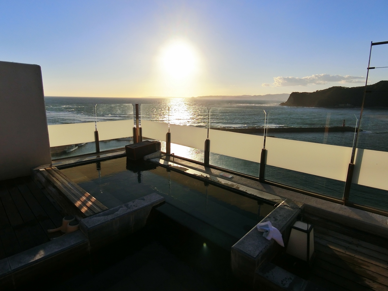 夕陽の宿100選の宿ということで、晴れた日には温泉や部屋から夕陽が沈むのを眺めることが出来ます。