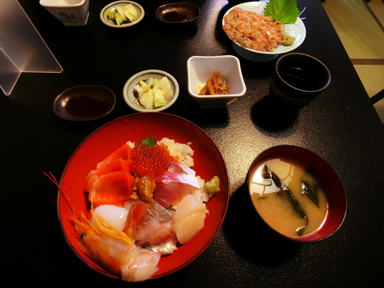 自分たちは海鮮丼を注文したのですが、地元で採れたという新鮮なアジやイカにマグロやホタテ、ウニ、イクラなどが添えられていてボリュームもあります。