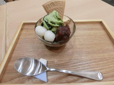 「とこサンデー(抹茶味)」という抹茶の蜜がかかった寒天に白玉、抹茶味のソフトクリーム、あんこ、ウエハースが乗っているものと、「ところてん(抹茶蜜)」のふたつ。