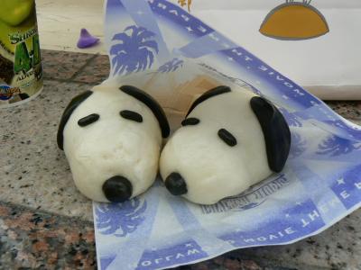 スヌーピーの顔の形をかなりうまく再現したまんじゅうです。肉まんあんまんみたいな感じで中身はカスタードクリームですが、味もけっこういけました。かわいくてなかなか食べられません。