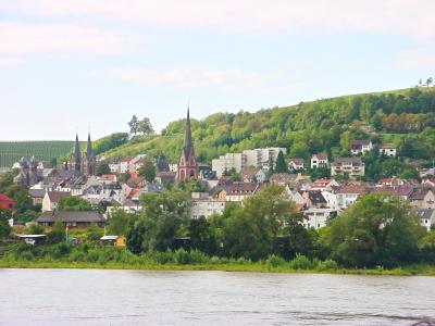 【ライン川沿いのぶどう畑】ライン川沿いには、多くのワイン用ぶどう畑が見...