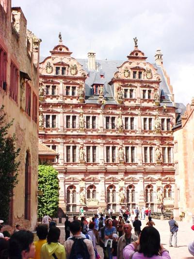 【ハイデルベルク城内】正面の建物は、何十体もの像が埋め込まれていました...
