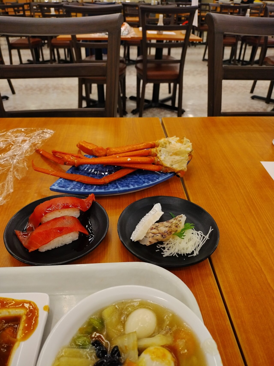 食事はバイキング。通常のコースはアルコールはワンドリンクのみ無料。アップグレードコースでアルコール飲み放題も出来る。アワビ、鰻、蟹付きコースにしてみたが11000円であった。- 旅行時期
