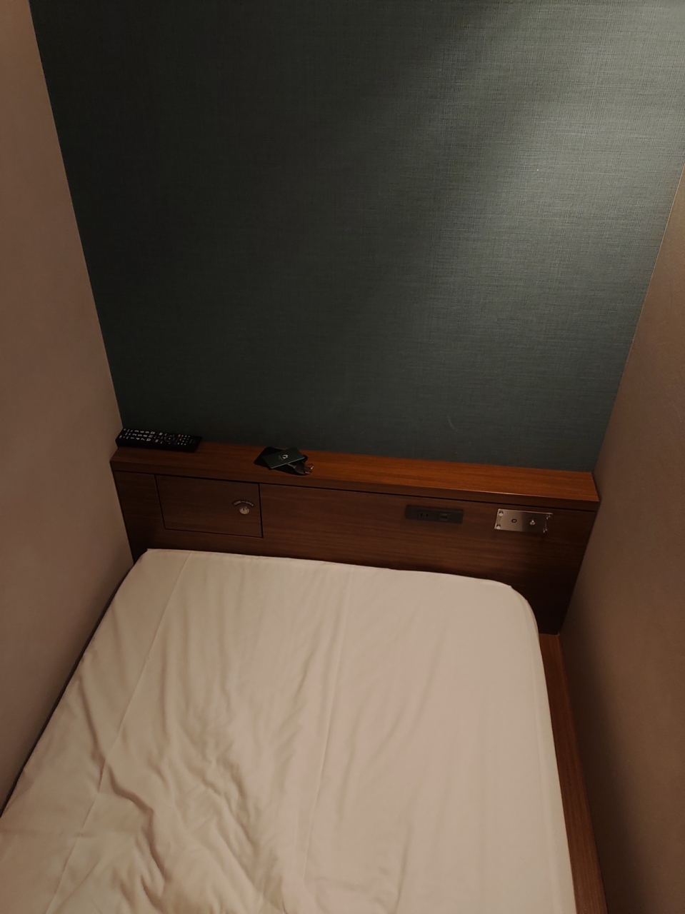 通常のカプセルホテルと違い2畳程のキャビン仕様となっています。布団のマットのクッションの寝心地はよかったです。大浴場完備。深夜2時まで入浴できます。