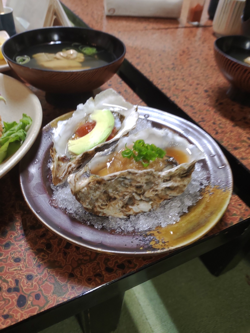 料理はというと生牡蠣、牡蠣フライ、牡蠣鍋、カレイの塩焼き、ホタテの刺身、ツブ貝の和え物等厚岸の海産物を満喫することができました。朝食も牡蠣汁、スジコ等の提供があり満足でした。
