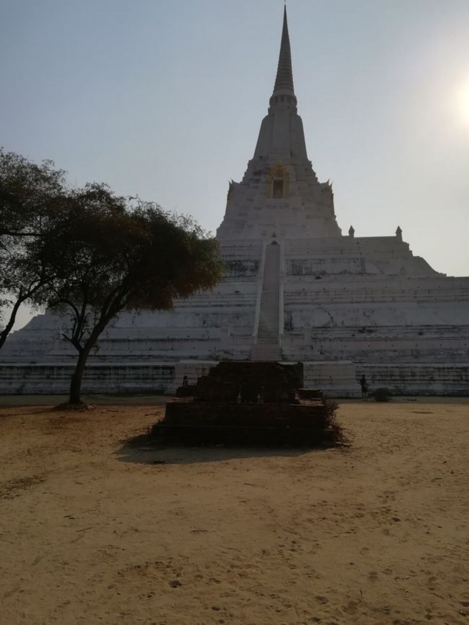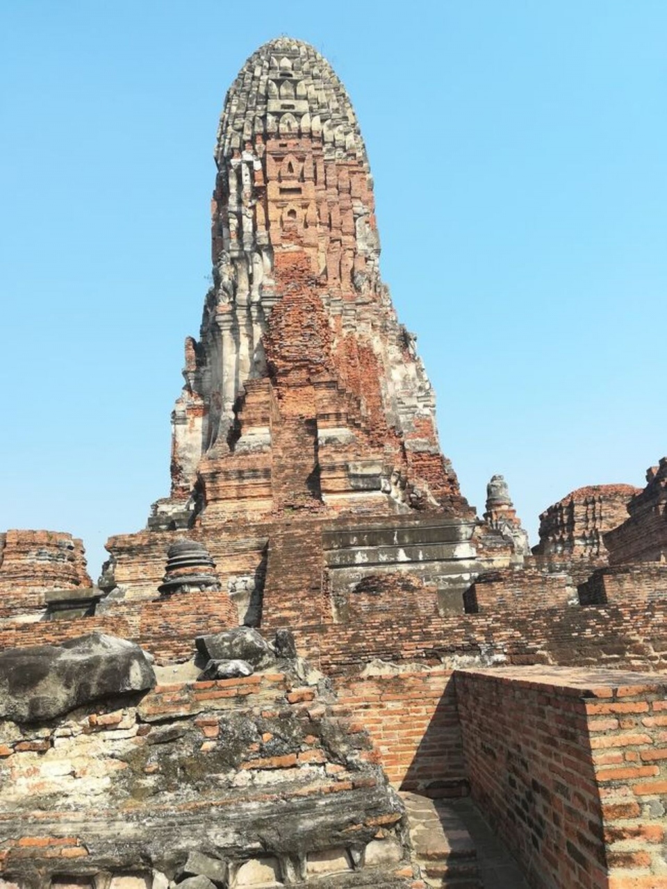 1569年、ビルマのバイナウン王がアユタヤを占領した時に建てた高さ80mを誇る寺院であります。当初はビルマ様式でしたが、その後アユタヤ王朝を再興したナレスアン王がタイ様式に改め、現在の塔は1754年に造られましたとのこと。1956年には仏歴25世紀を祝って頂上に2.5kgの黄金の珠が付けられ別名「黄金の仏塔寺院」と呼ばれているそうです。仏塔は階段で上に上れるようになっており、頂上からは遠くアユタヤの街が一望できます。