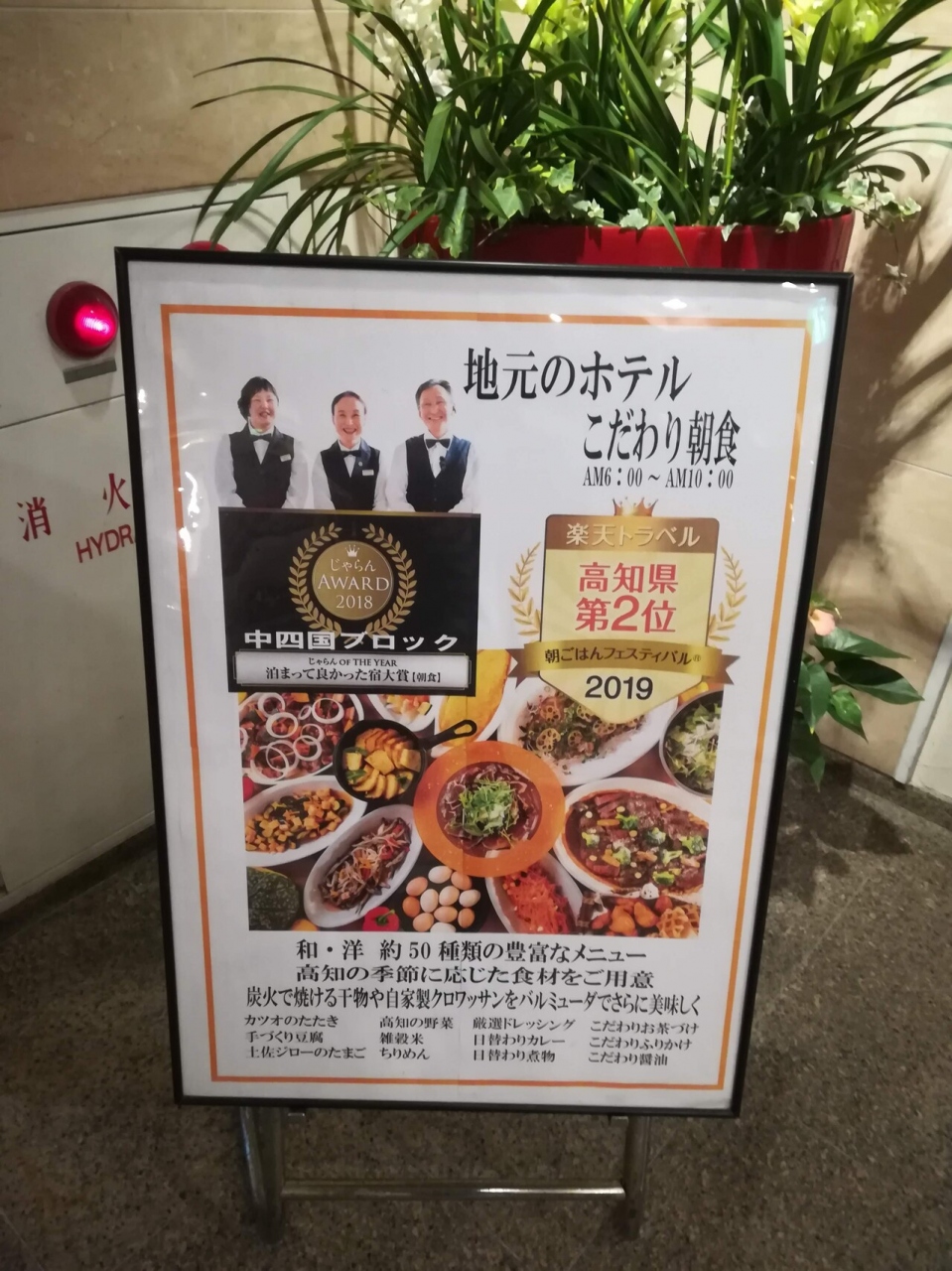 ここのホテルは何といっても朝食バイキングだと個人的に思います。カツオのカルパッチョやチキン煮込みカレー、カットステーキなど朝食バイキングを美味しく頂くことが出来ると思います。楽天トラベルの食事部門で2019年度高知県で2位をとっただけあると思いました。