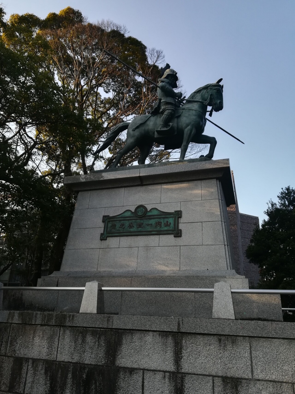 高知城の近くにあります。馬に乗って威風堂々としていると思います。山内一豊の妻の銅像もこの近くにありますが妻の出所や名前が諸説あって定かでないのは初めて知りました。がおしどり夫婦だったことは間違いないのでしょうね。